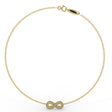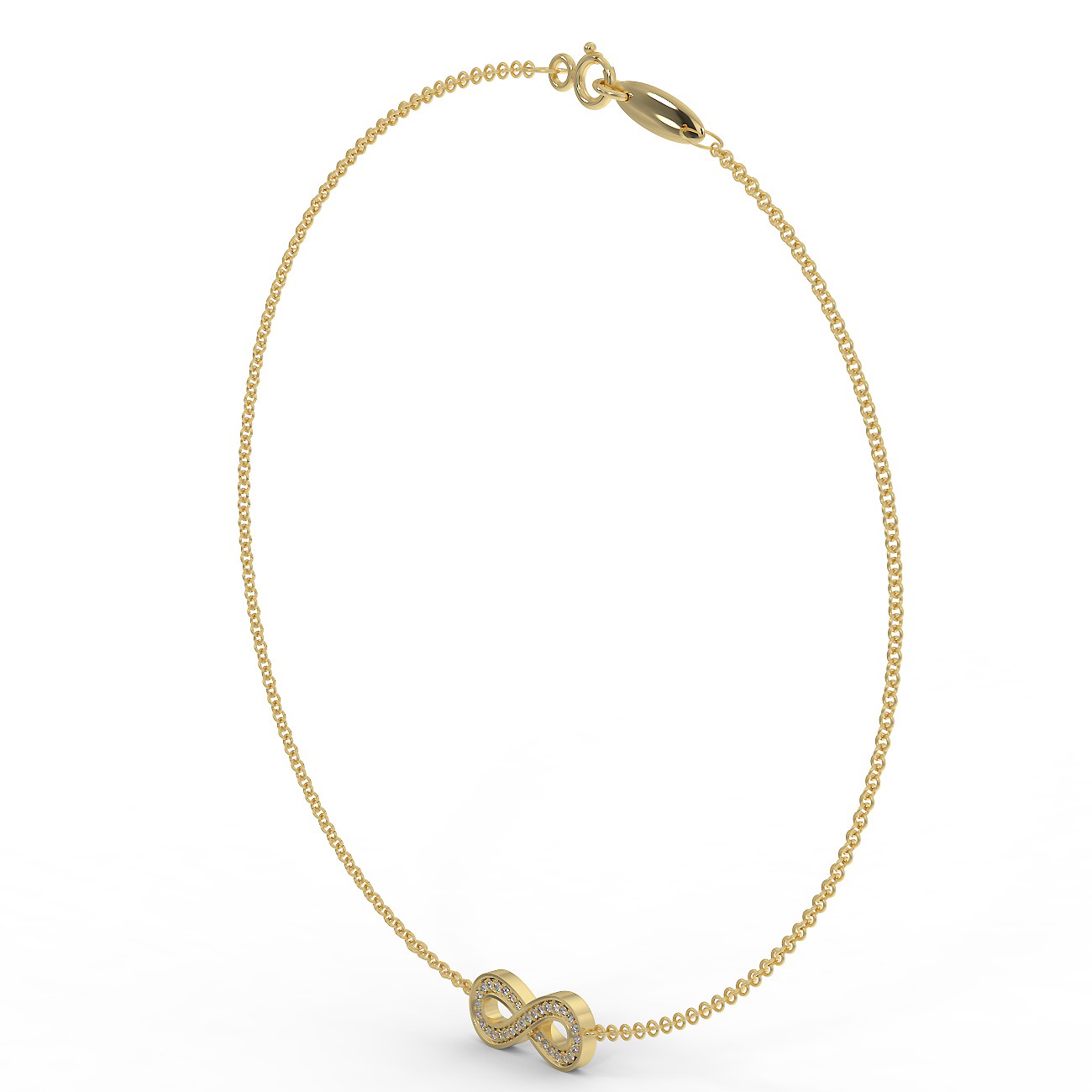 A delicate bracelet crafted from 14K (585) yellow gold. A luminous diamond accent in the form of an infinity symbol, densely set with tiny diamonds, adorns the bracelet. The diamonds' high-quality cut, high color, and purity, combined with the beautiful hue of the yellow gold from which the bracelet is crafted, lend the bracelet a touch of elegance. Its classic chain finish makes it a stylish complement to any jewelry piece crafted from this precious metal.
