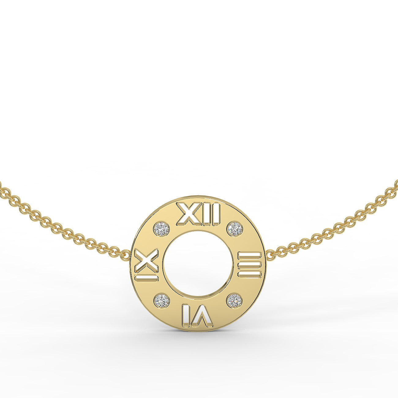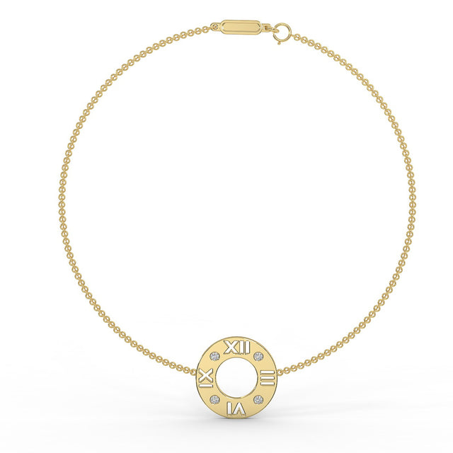 A classic, beautifully crafted yellow gold bracelet. The bracelet features a unique, round element resembling a clock face with Roman numerals, set with diamonds weighing a total of 0.12 ctw.