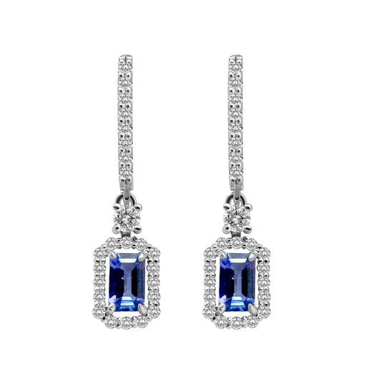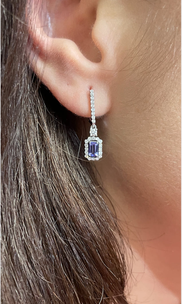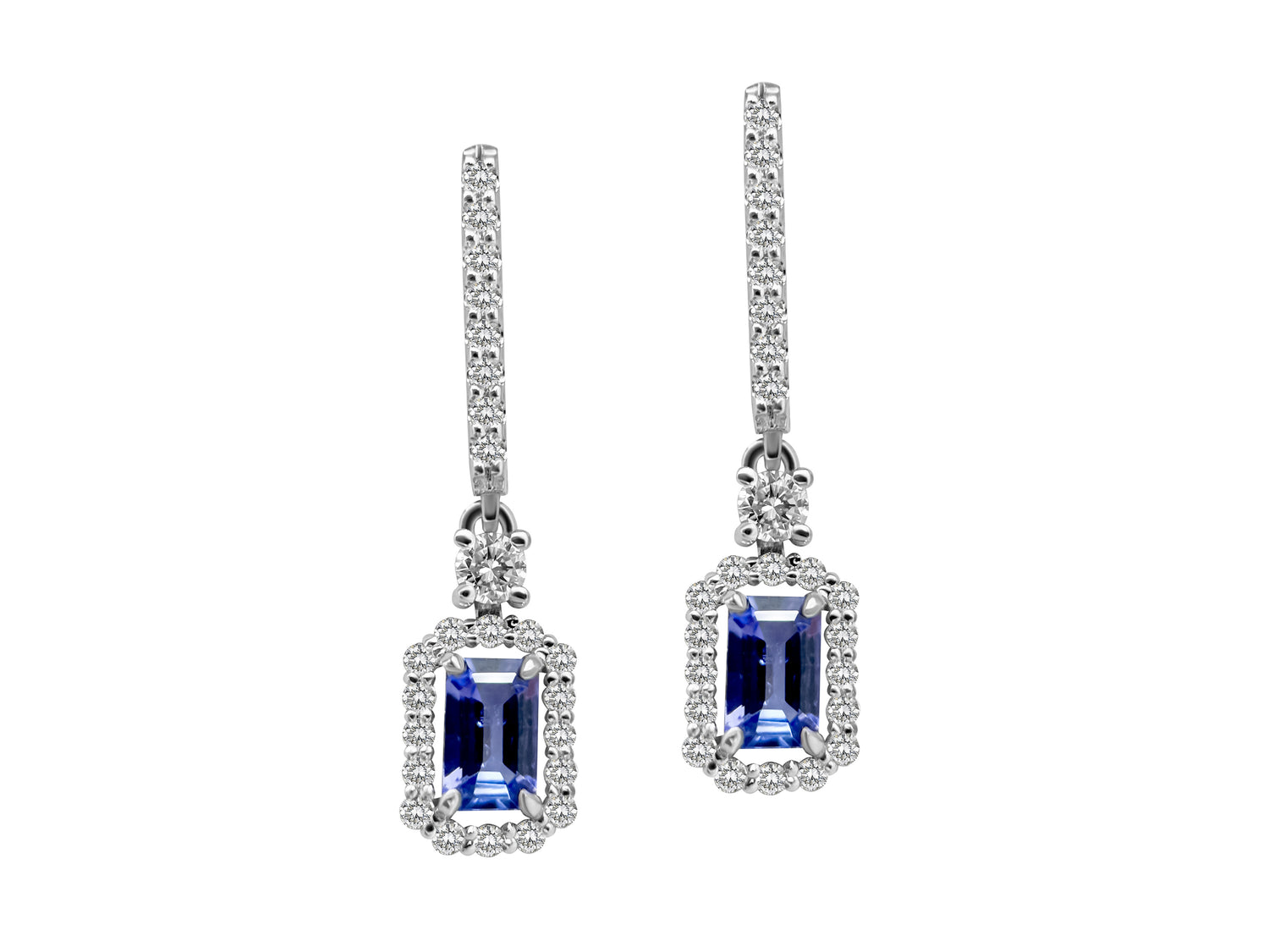 These unique tanzanite and diamond earrings, crafted in white gold, look stunning on the ear. The total stone weight is 1.12 ctw.