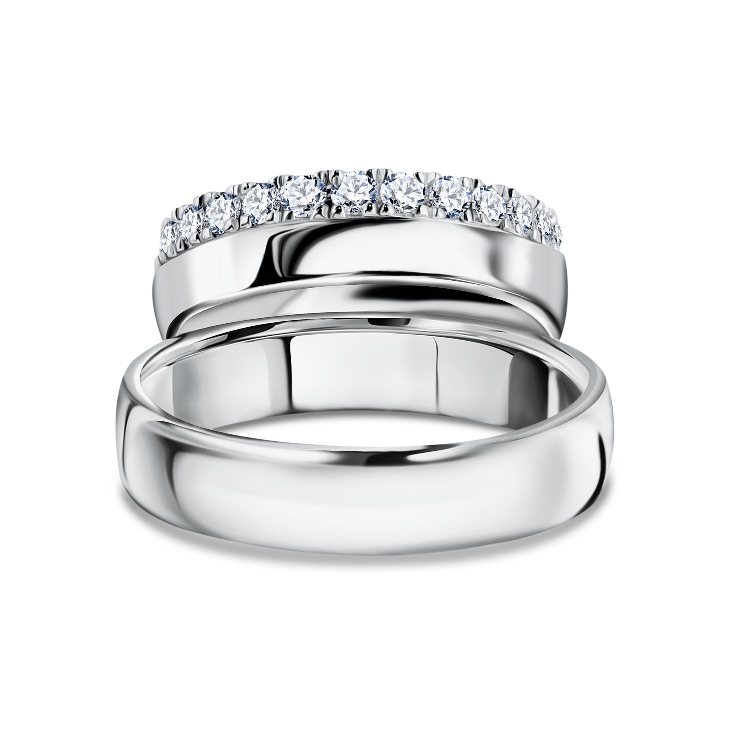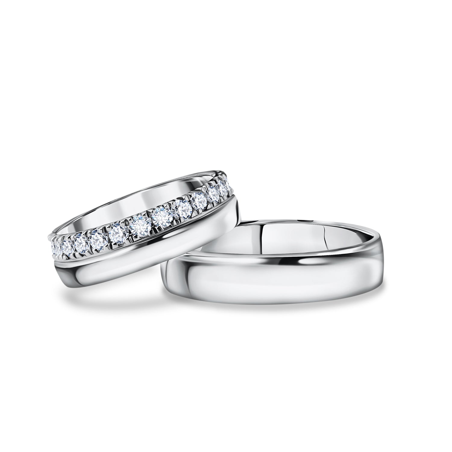 The exclusive Diamond Elegance wedding rings, crafted in white gold, are an expression of elegance and high-quality craftsmanship. The women's model boasts a unique feature: diamonds are set at the edge of the band, giving it an interesting and original shape. Each stone is precisely set, creating an elegant and sparkling array that catches the eye. The men's band features a minimalist design, with a smooth, polished surface, perfectly complementing the more ornate women's model.
