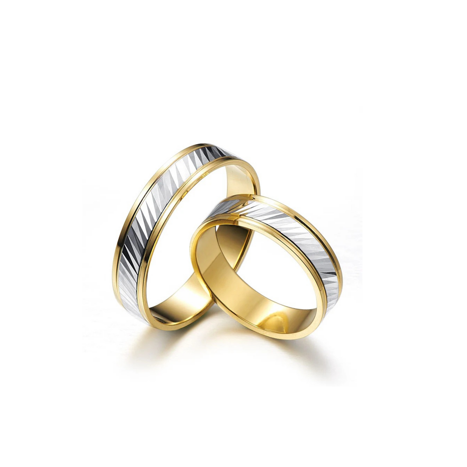 The rings are adorned with diagonal cuts and crafted from two-tone gold. The width of the rings is 5 mm. The average weight of a pair of rings is 8.5 grams (calculated for sizes D15 and M25).