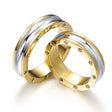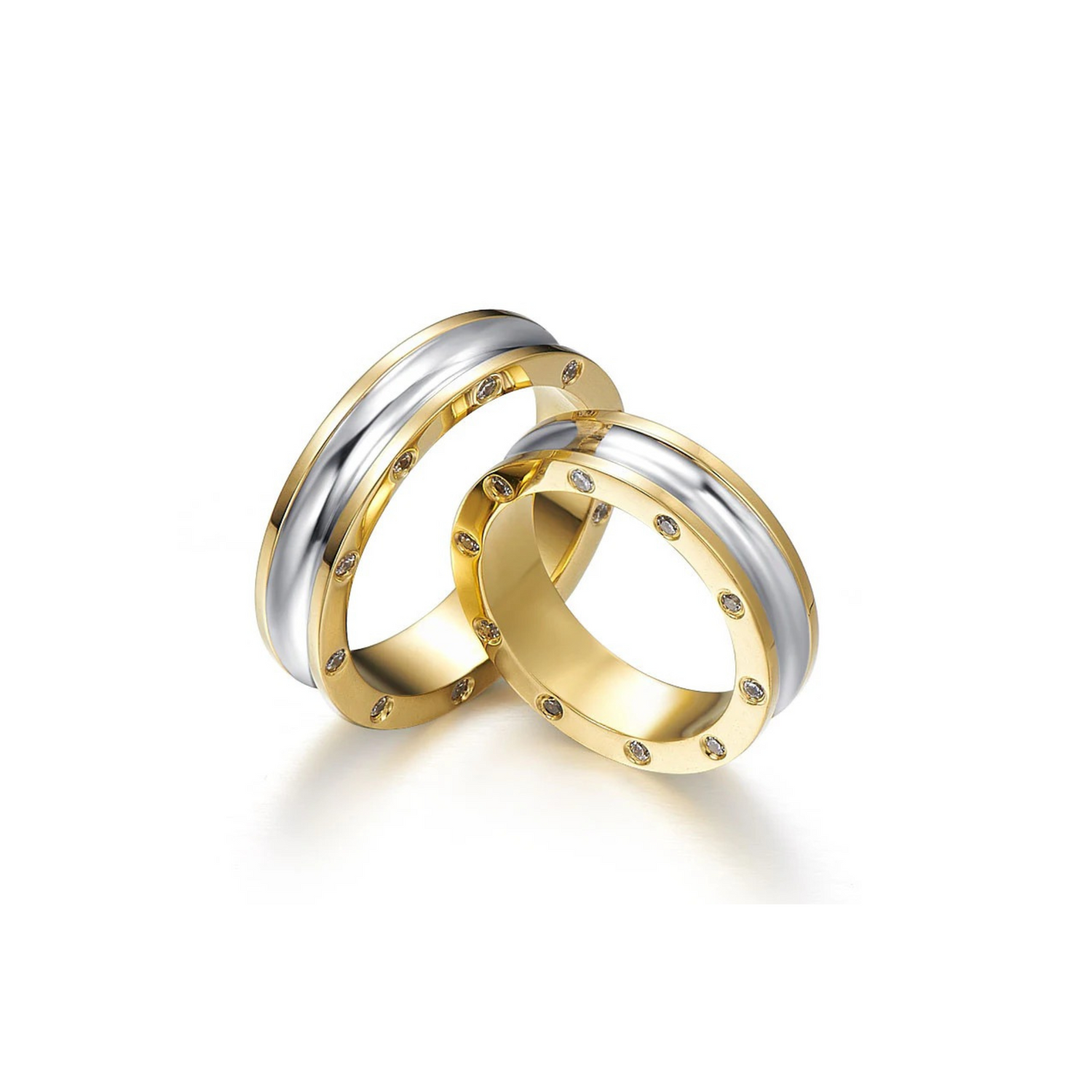 These unique wedding rings are crafted from a combination of white and yellow gold, adorned with numerous small diamonds. The stones are set on the sides of both the women's and men's bands. Prices are based on sizes D15-M25, and for larger sizes, the price may change.