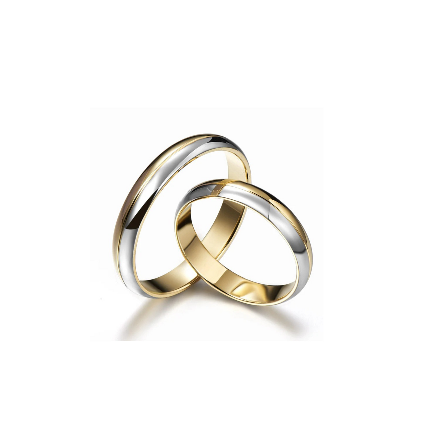 The wedding rings presented here are crafted from two types of gold: yellow and white. They are 4mm wide and weigh 7.5g in total (for sizes M25 and D15). The smoothly rounded edges of the rings create a remarkably subtle effect.