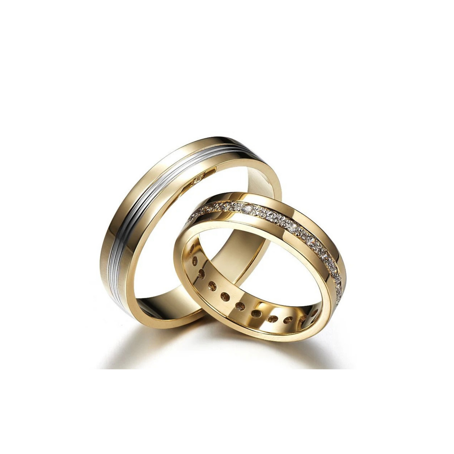 Elegant wedding rings crafted from yellow gold with delicate white gold embellishments. The women's band is adorned with diamonds, whose brilliance is further enhanced by the white gold band. The rings are 5mm wide and weigh a total of 8.5g (for sizes M25, D15).