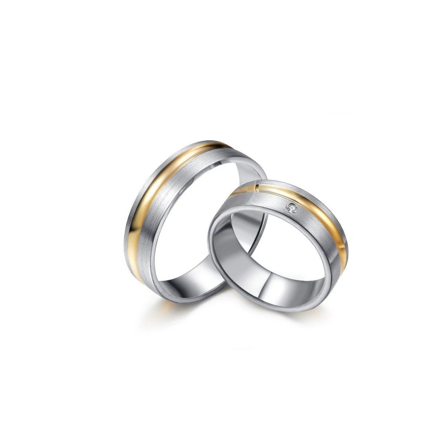 White gold wedding rings with a diamond in a women's size and adorned with a yellow gold band. Prices are based on sizes D15 M25, and for larger sizes, prices may change.