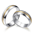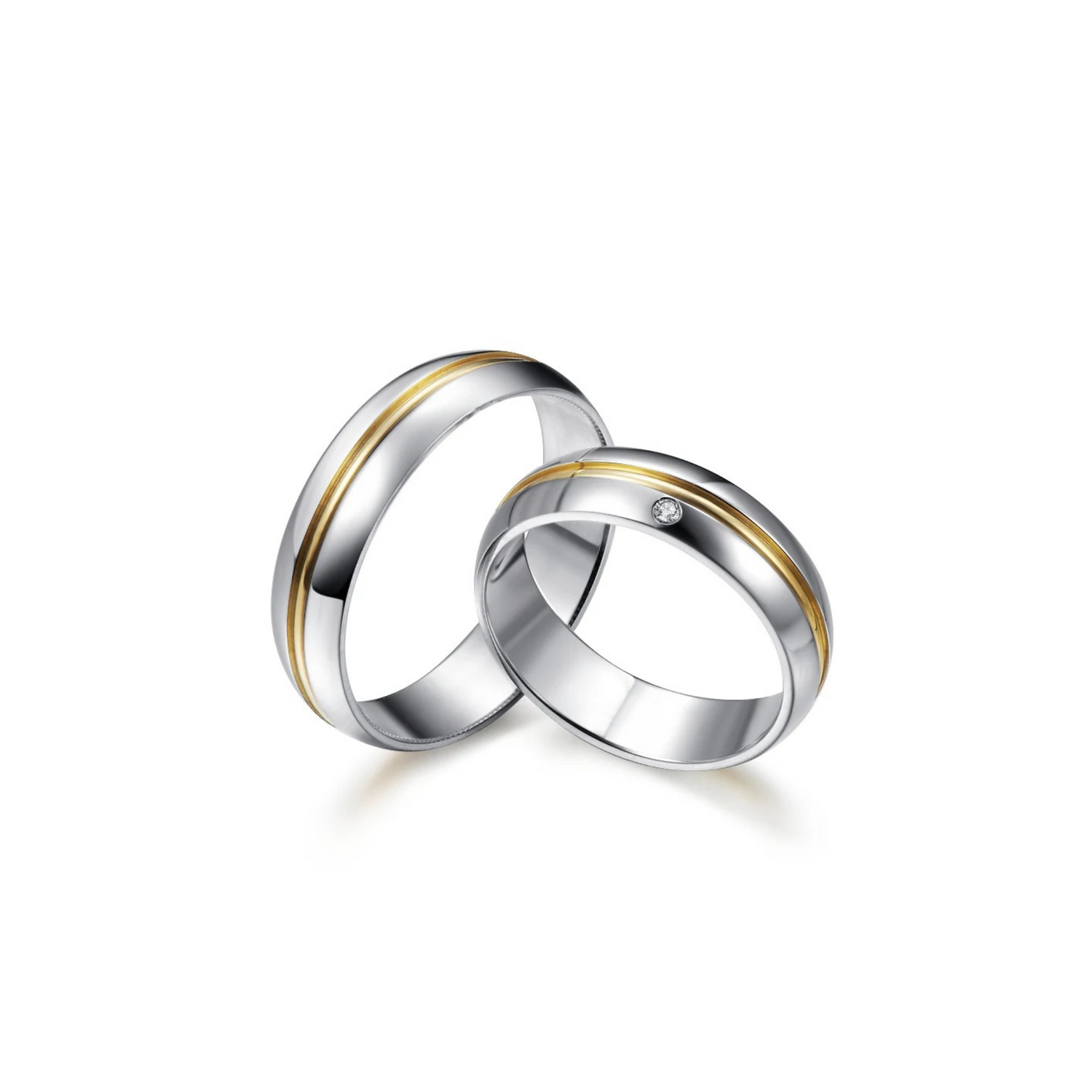 These semicircular wedding rings are crafted in white gold. The rings are adorned with a symbolic diamond in the women's band and a yellow gold band that encircles both bands. The price of the rings is calculated for sizes D15-M25; for larger sizes, the price may change.