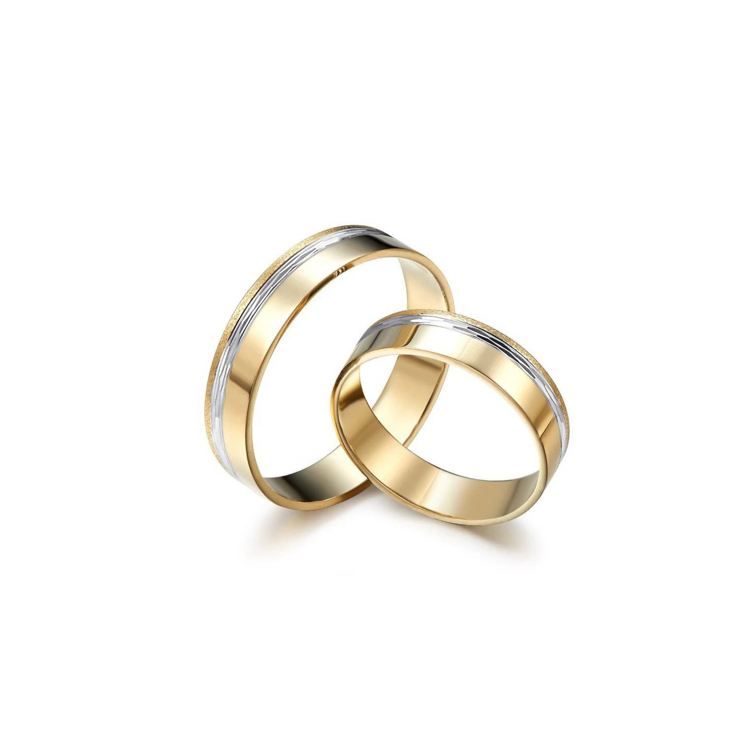 The yellow gold of these rings is beautifully brightened by a delicate white gold pattern, created by longitudinal grooves. This interesting design definitely sets these rings apart from others. Prices are based on sizes D15 M25; for larger sizes, the price may change.