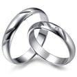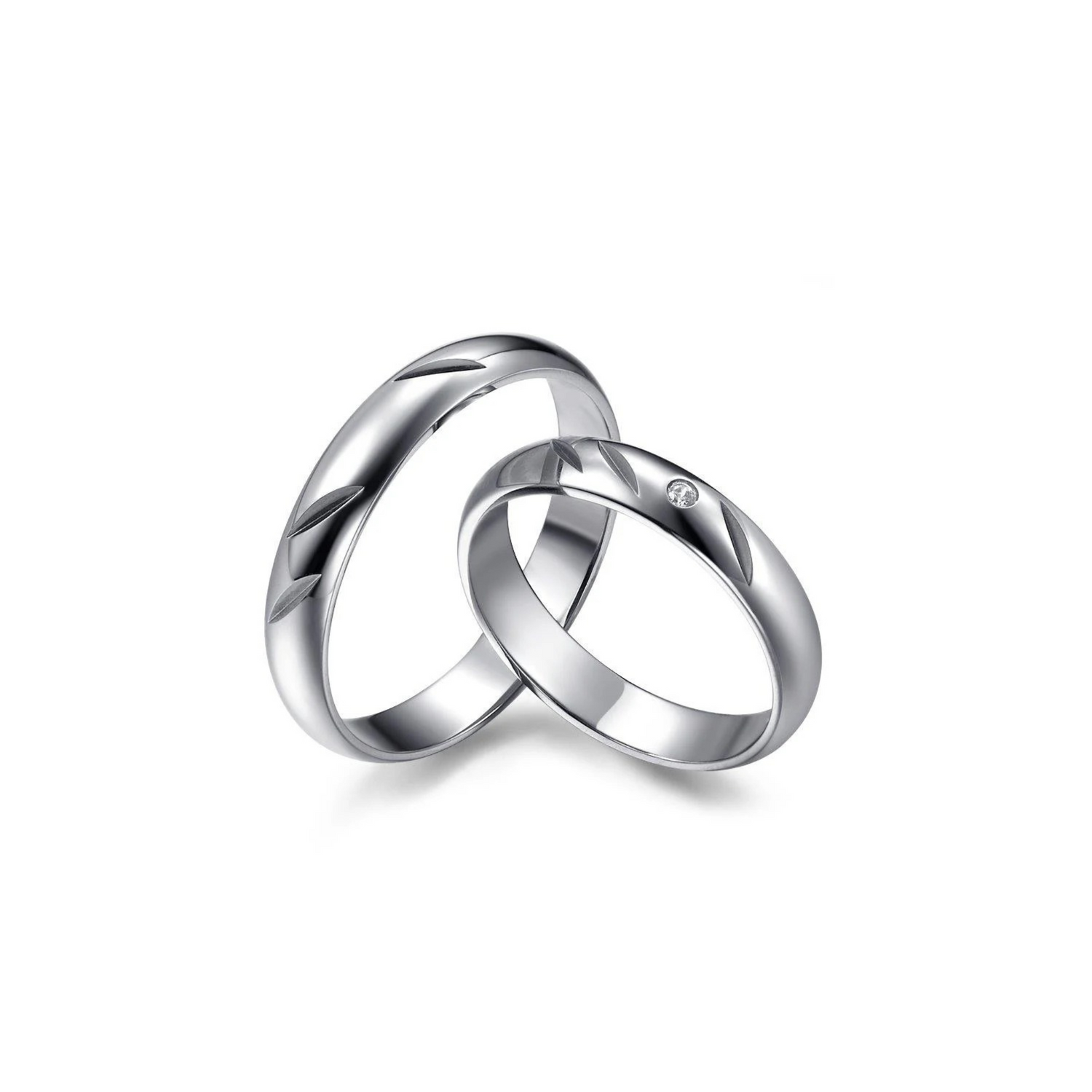 A set of white gold wedding rings. Precise craftsmanship and meticulous polishing ensure comfortable wear and a unique appearance, accentuated by three longitudinal grooves. A sparkling diamond has been set in the women's version to subtly enhance it. Prices are based on sizes D15-M25; larger sizes may vary.