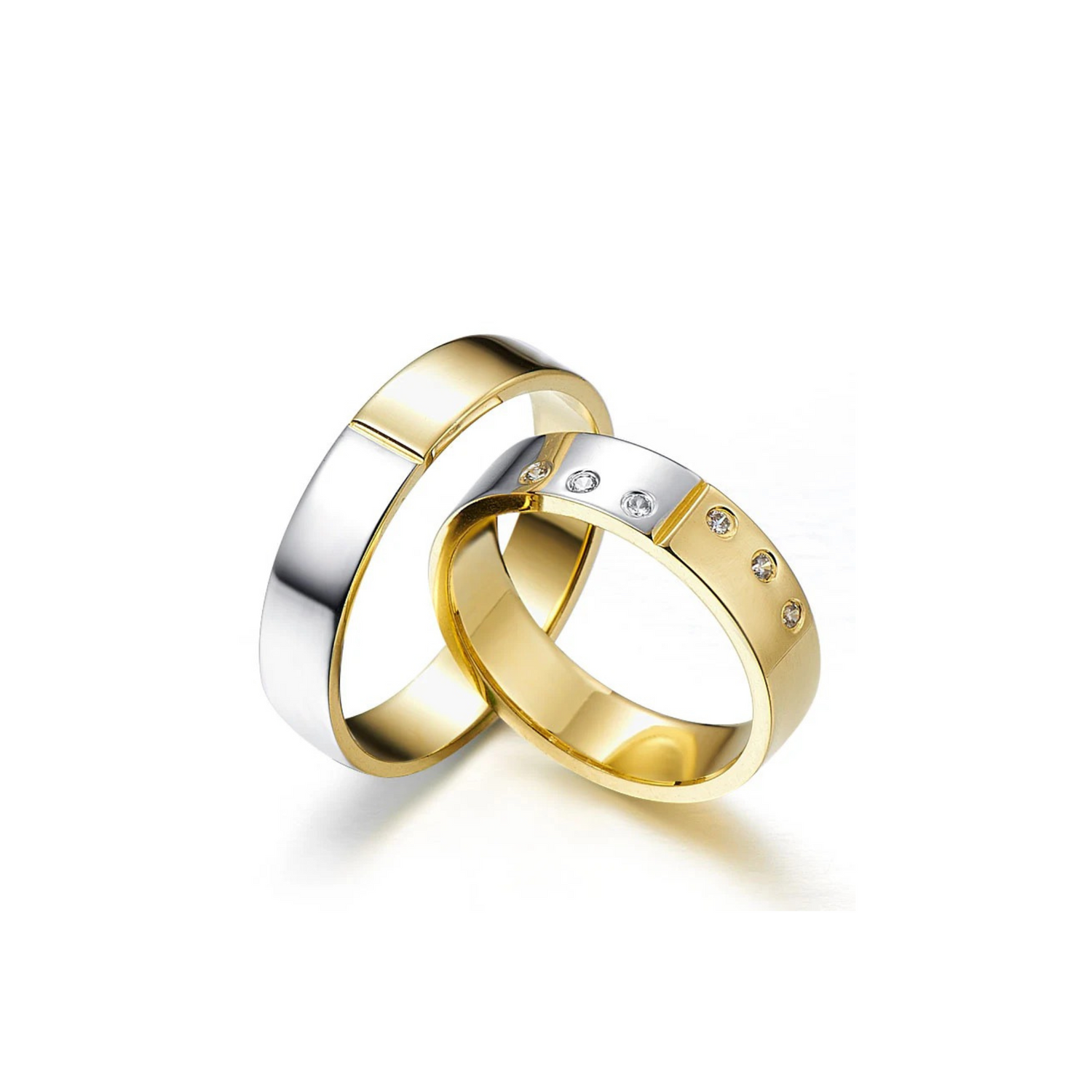 These unique wedding rings, crafted from two-tone gold, are set with six diamonds weighing a total of 0.09 ct. They are 5 mm wide and weigh 9.5 grams per pair (weight based on sizes D15 and M25).