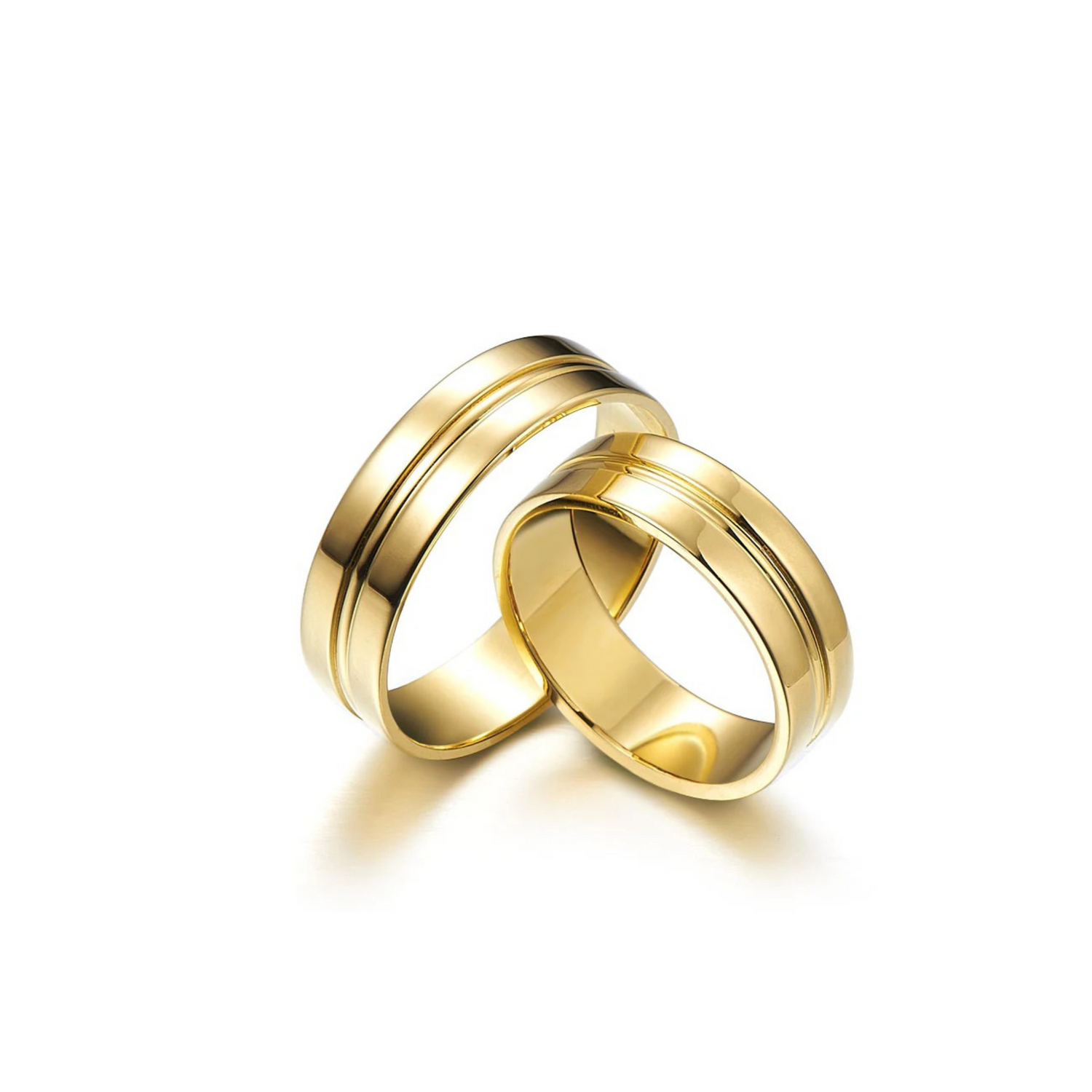 Yellow gold wedding rings decorated with two stripes. The width of the rings is 6 mm. The average weight of a pair of rings is 11 grams (calculated for sizes D15 and M25).