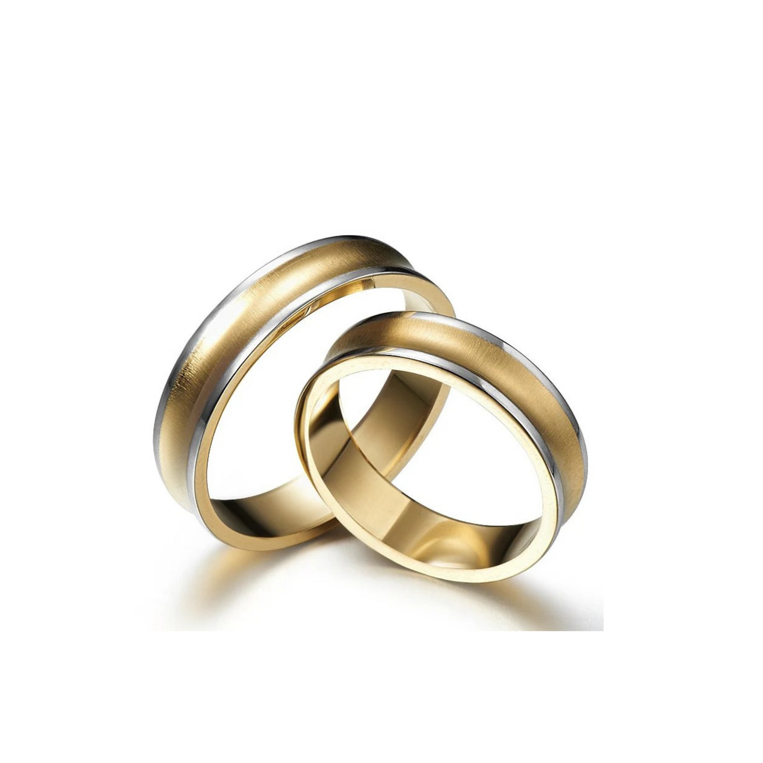 The rings are crafted from 14K (585) yellow and white gold. Each ring is 5mm wide and weighs a combined 8.5g (for sizes M25, D15).