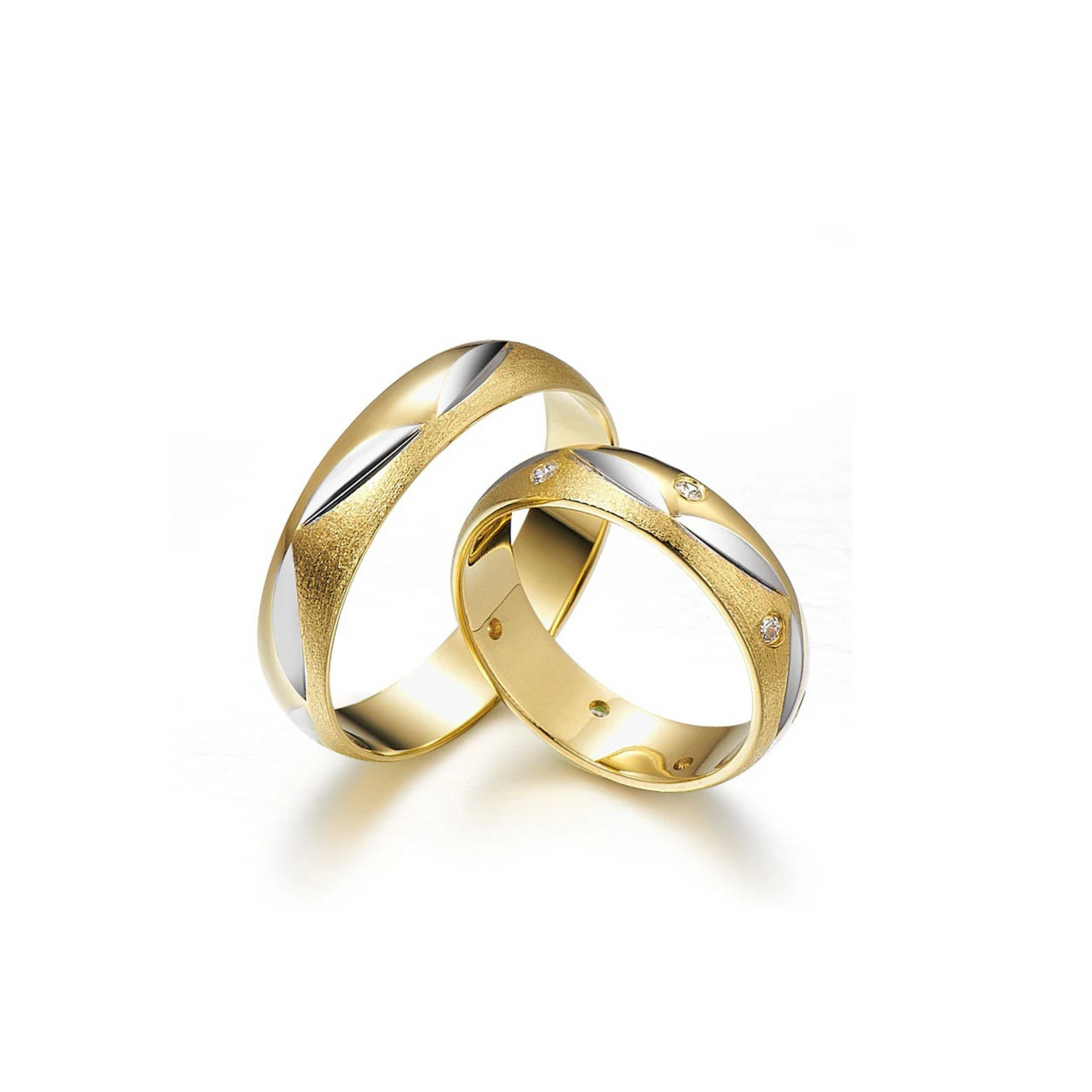 These unique two-tone gold wedding rings are adorned with eight diamonds weighing a total of 0.12 ct. They are 5 mm wide and weigh 9 grams per pair (weight based on sizes D15 and M25).