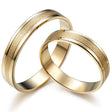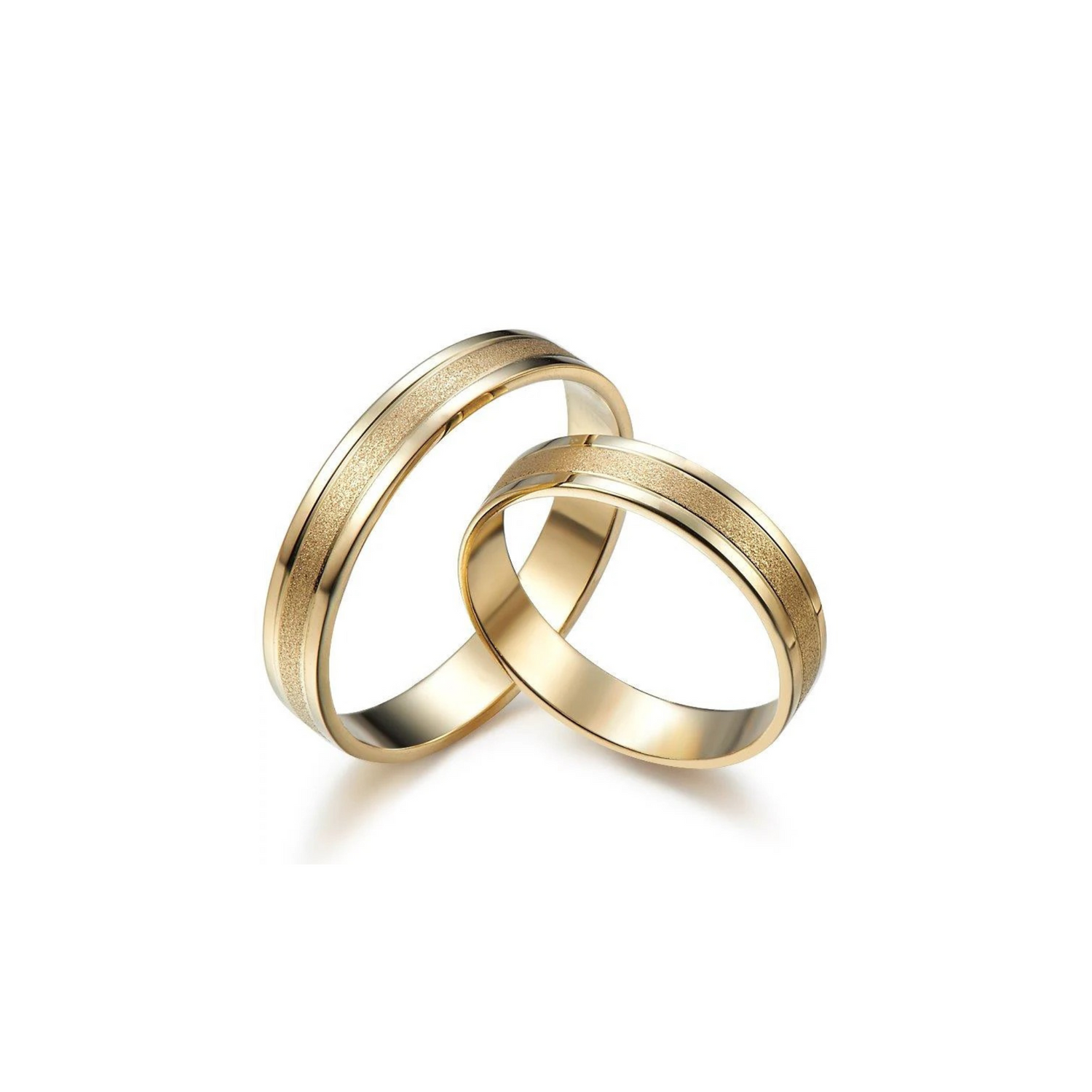 Wedding rings crafted from yellow gold. The embellishment combines matte gold with shiny stripes on the edges of the rings. This treatment creates a light and delicate feel on the hand. Ring prices are based on sizes D15-M25; for larger sizes, the price may change.