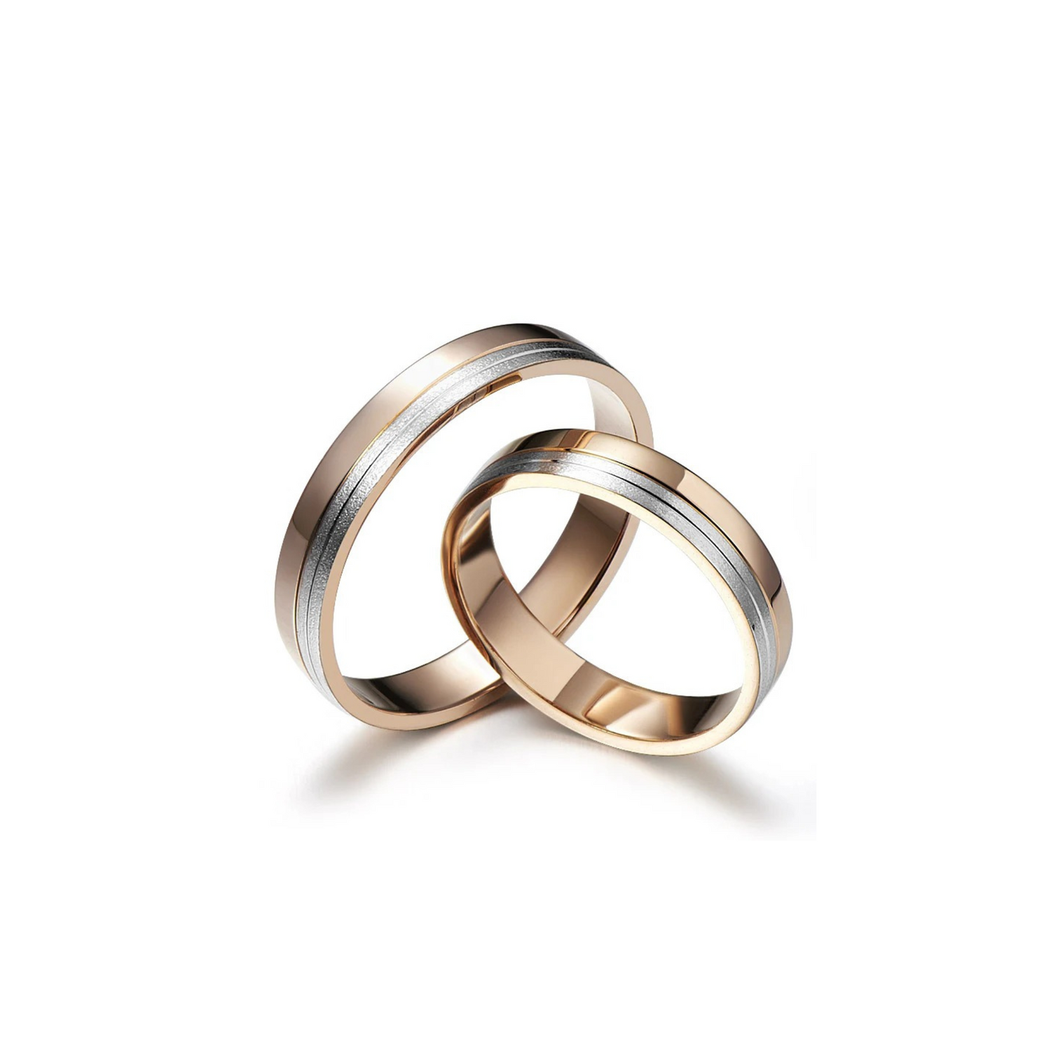 Beautiful yellow gold wedding bands with a white accent. Beautiful rose gold wedding bands adorned with two delicate white stripes. The combination of two gold colors makes it easy to match other jewelry in these colors.