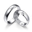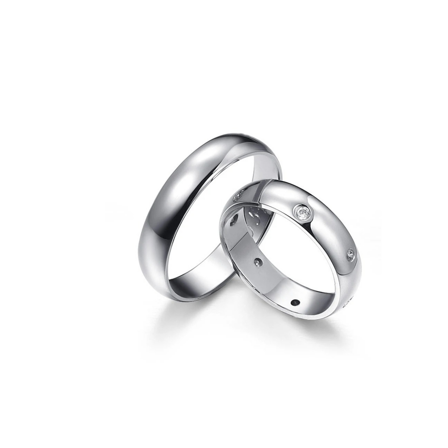 These wedding rings are perfect for a couple who appreciates a blend of classic lines and modernity. Crafted from white gold, they intrigue and inspire a closer look at the women's wedding band. It is adorned with seven diamonds, enhancing the rings' charm.