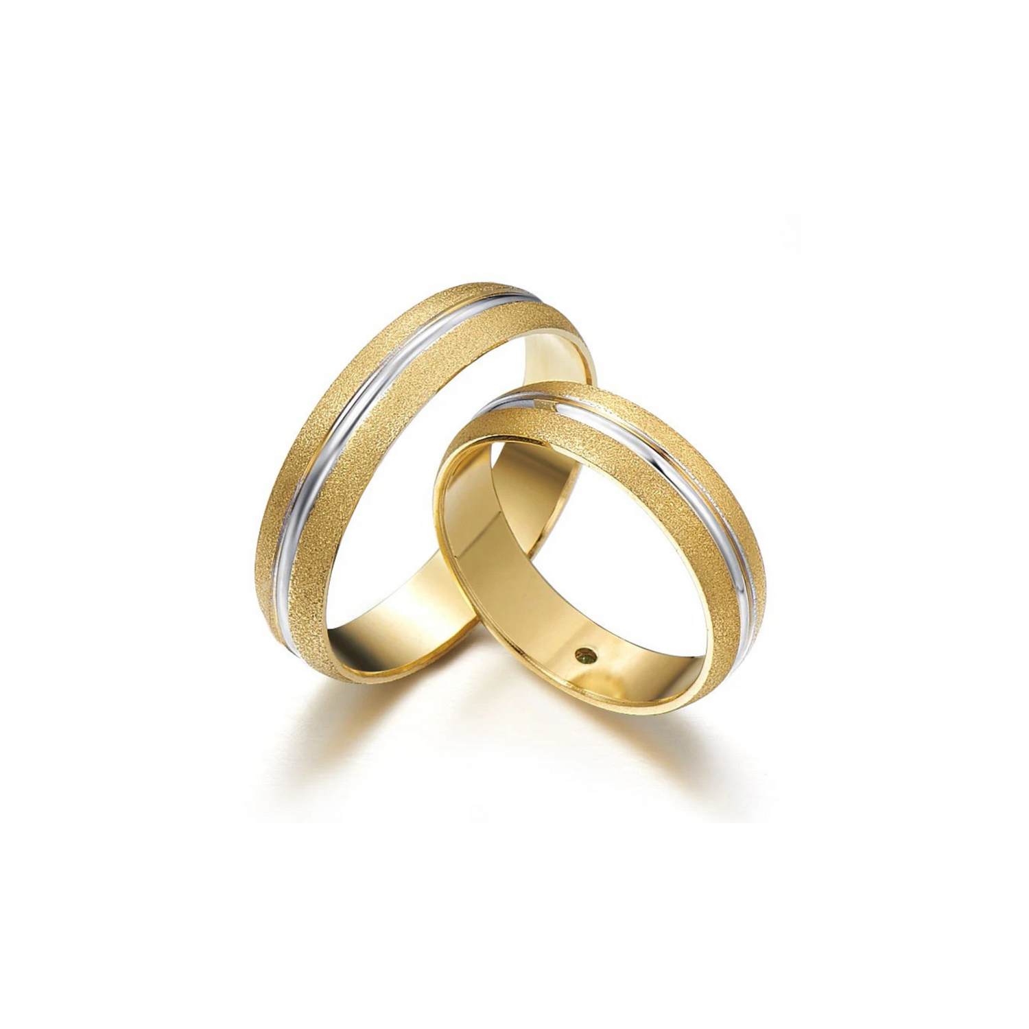 The highlight of these wedding rings is the contrast between the matte yellow gold and the delicate, sparkling pattern along the entire band. A symbolic diamond is set on the women's band. Prices are based on sizes D15 M25; for larger sizes, the price may change.