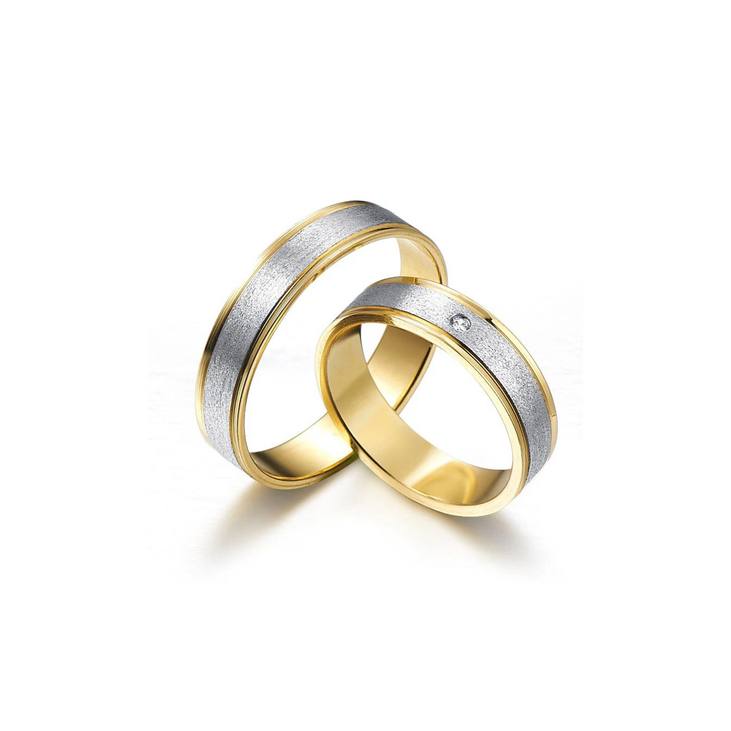 These charming wedding rings are crafted from shiny yellow gold with a matte white gold top coat. The women's band is additionally adorned with a diamond.