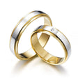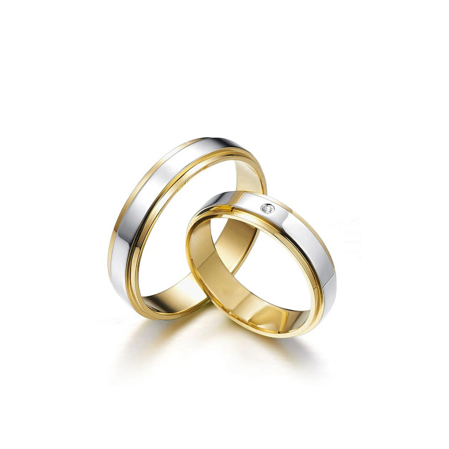These exceptionally interesting wedding rings are crafted from two-tone gold and adorned with a 0.015-carat diamond. The width of the rings is 5 mm. The average weight of a pair of rings is 9.5 grams (calculated for sizes D15 and M25).