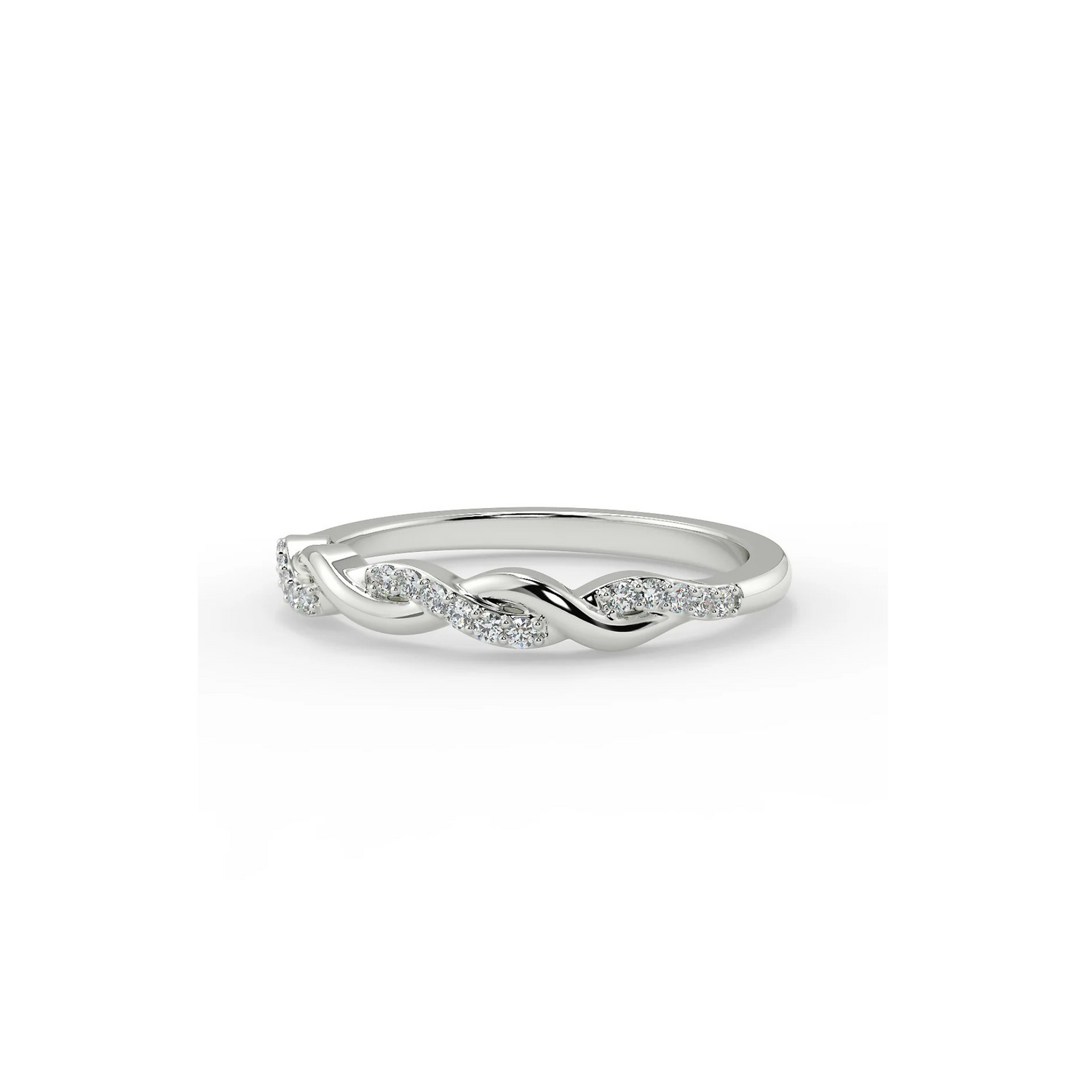 Its upper section is adorned with interwoven bands – one set with sparkling diamonds, the other smooth and delicately shimmering. This refined detail gives the ring a unique, feminine character, emphasizing its timeless style. The well-thought-out design, with a stone-free space, facilitates future size adjustments, ensuring comfort for years to come.