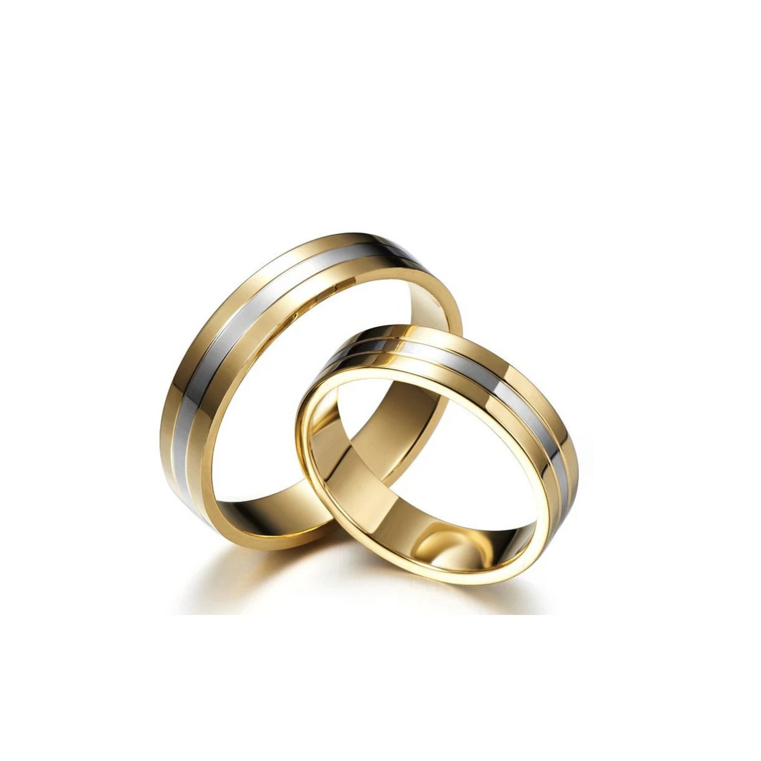 Elegant wedding rings in a combination of yellow and white gold are a perfect choice for a wedding and a life together. The warm shimmer of yellow gold is complemented by a delicate strip of white gold, creating a harmonious and stylish design. The rings are 5 mm wide, and each pair (sizes M25, D15) weighs 8.5 g. The identical design of the women's and men's versions emphasizes the unity of marriage. Ready for fast shipping – choose classic style and durability.