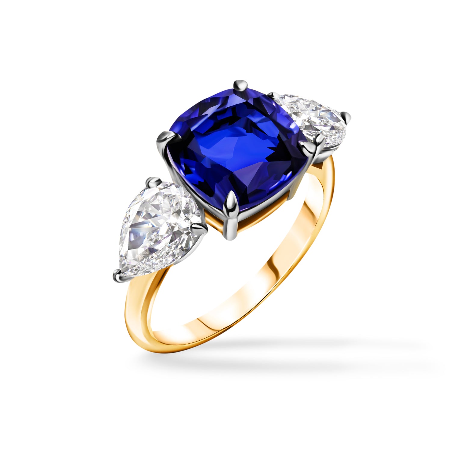 The "Blue Majesty" ring is a true statement piece, perfect for someone who appreciates elegance. The centerpiece is a stunning 4-carat sapphire. This stone is perfectly displayed, accentuated by two pear-shaped diamonds weighing 0.70 carats each, which add sparkle and brilliance, creating a spectacular setting. Its classic yet impressive appearance makes it not only a ring for special occasions but also an excellent choice for an engagement. Thanks to its stunning appearance, the "Blue Majesty" also makes a unique gift that will be cherished forever.
