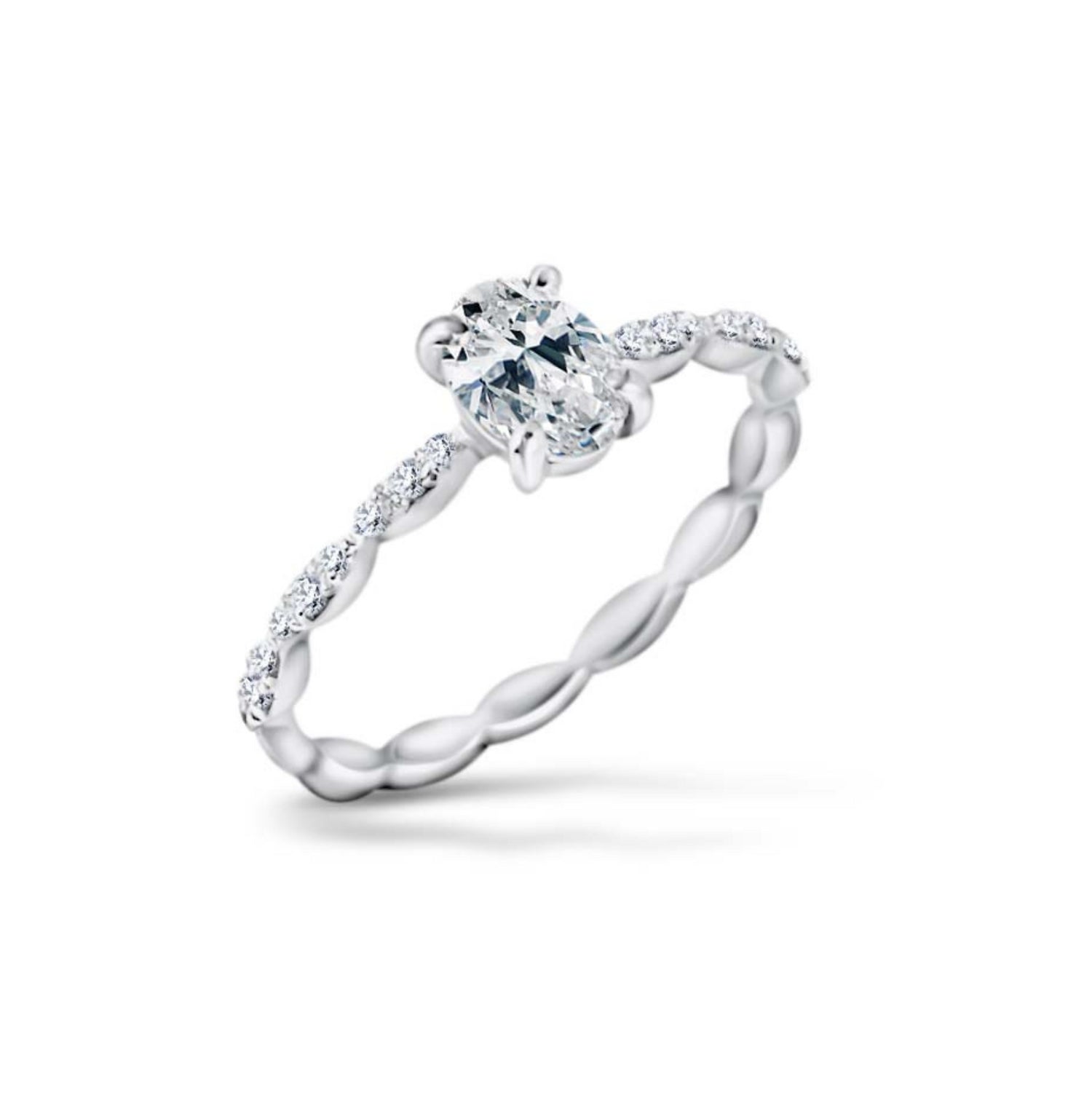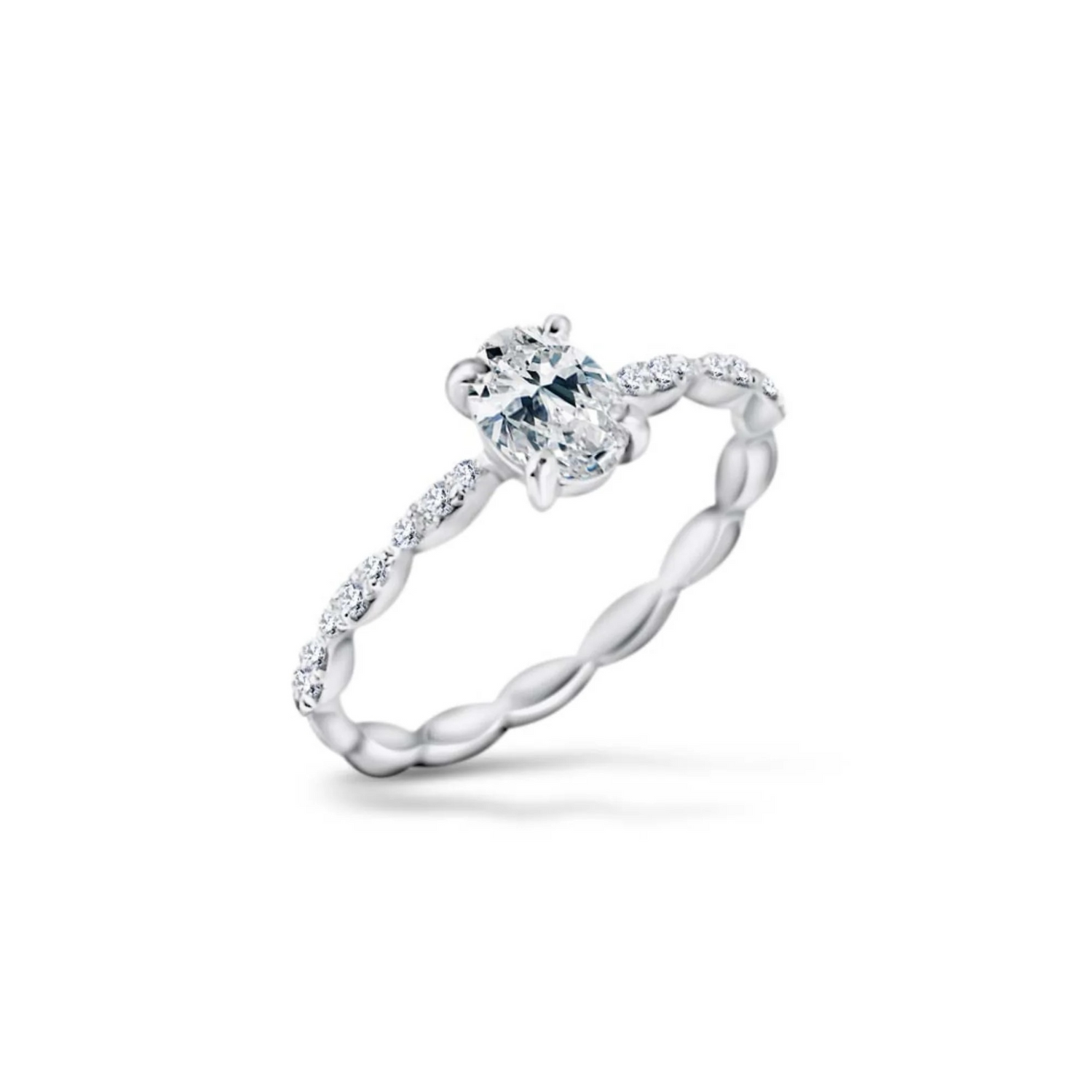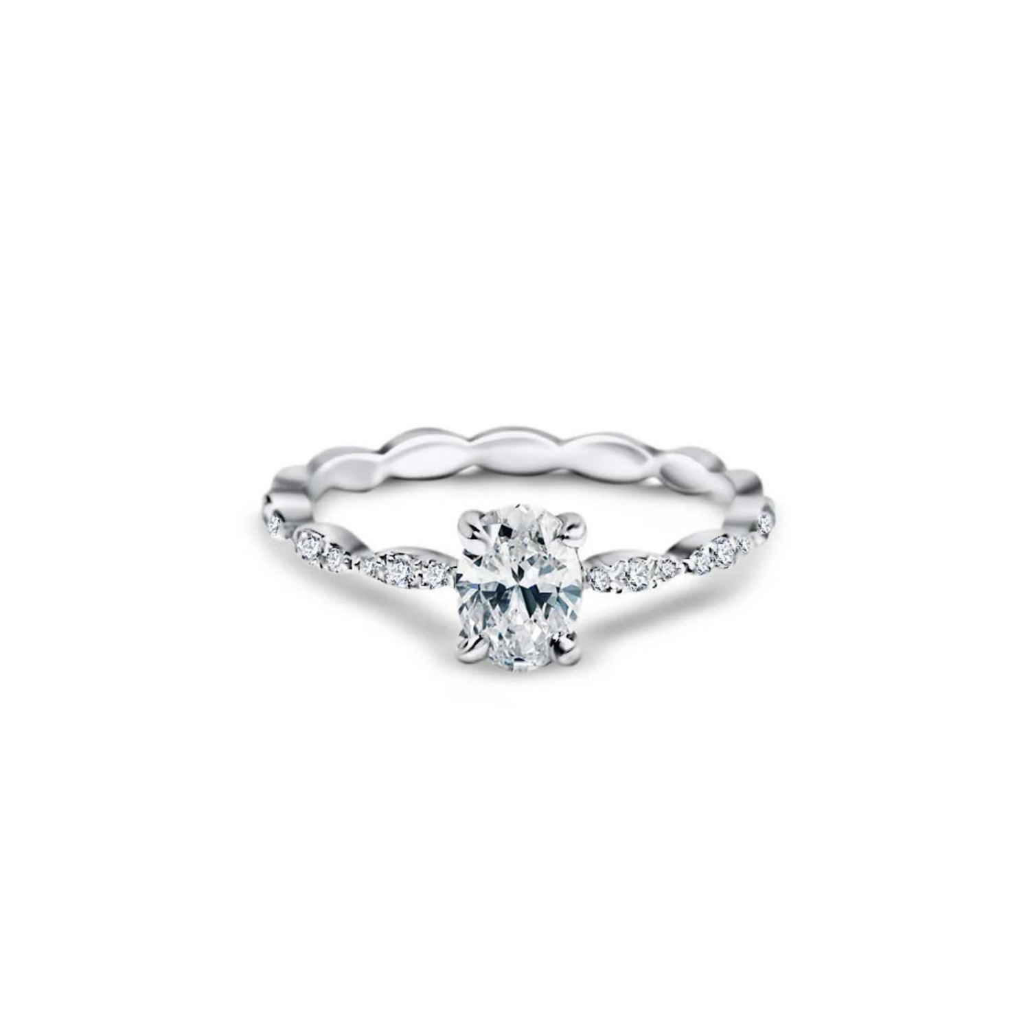 A beautiful oval diamond ring with a decorative, diamond-studded band. The diamond is certified by a third-party gemological institute, GIA, IGI, or HRD. The diamond ring can also be made in a different gold color.