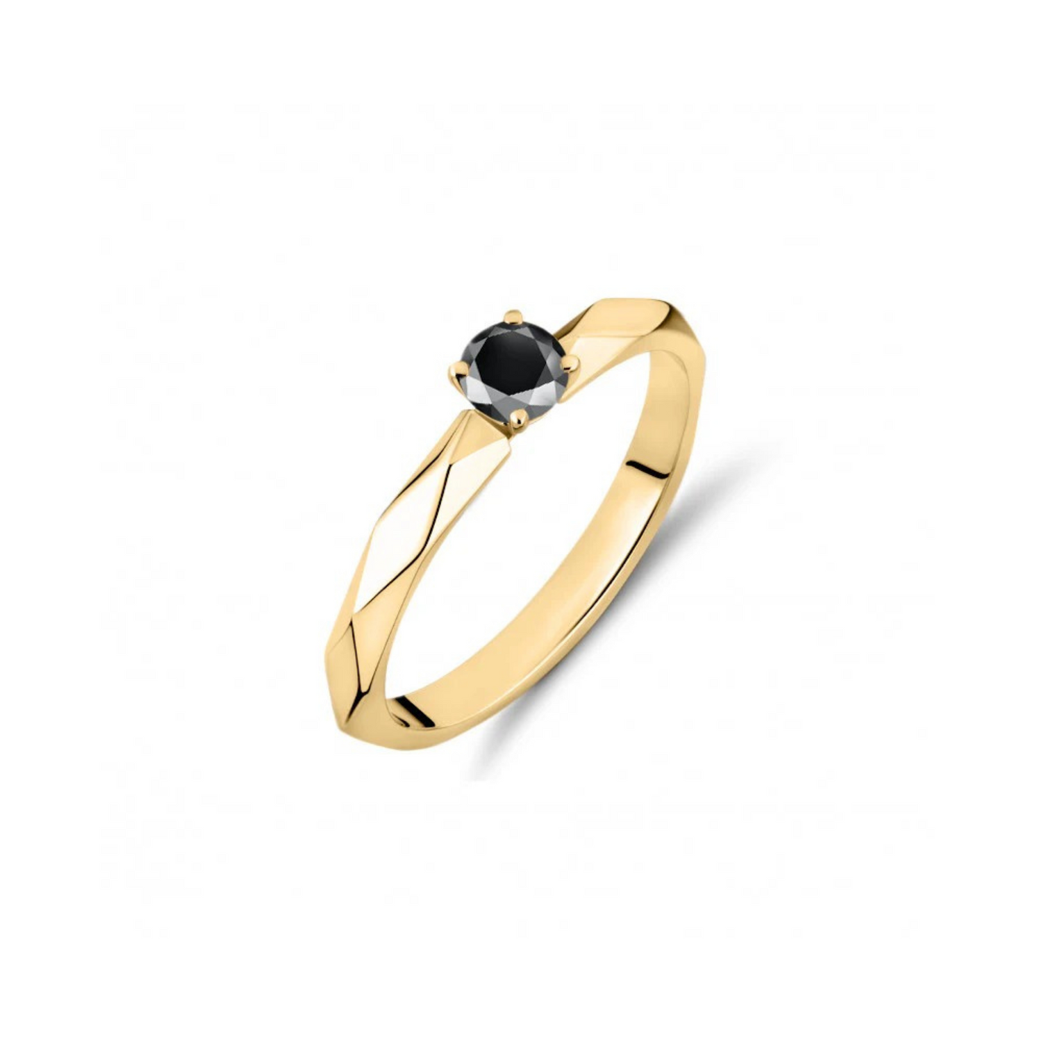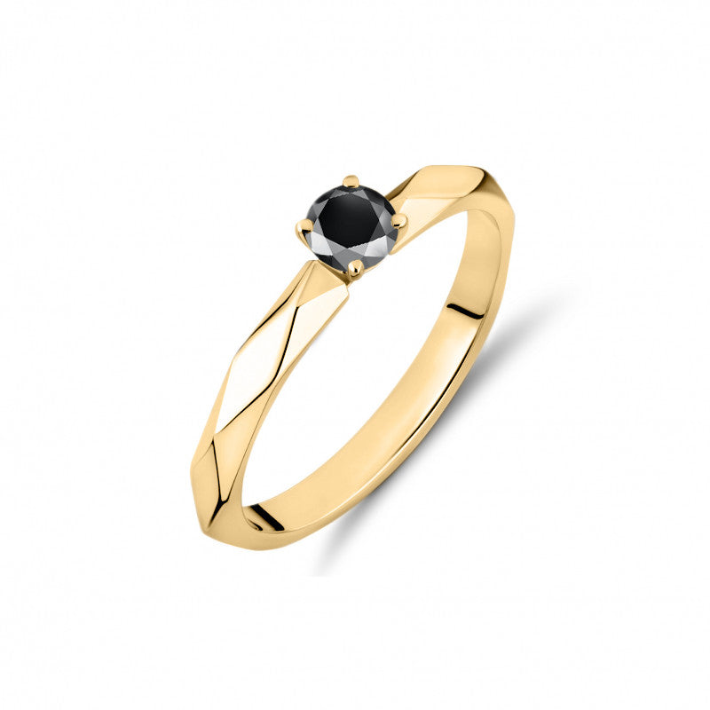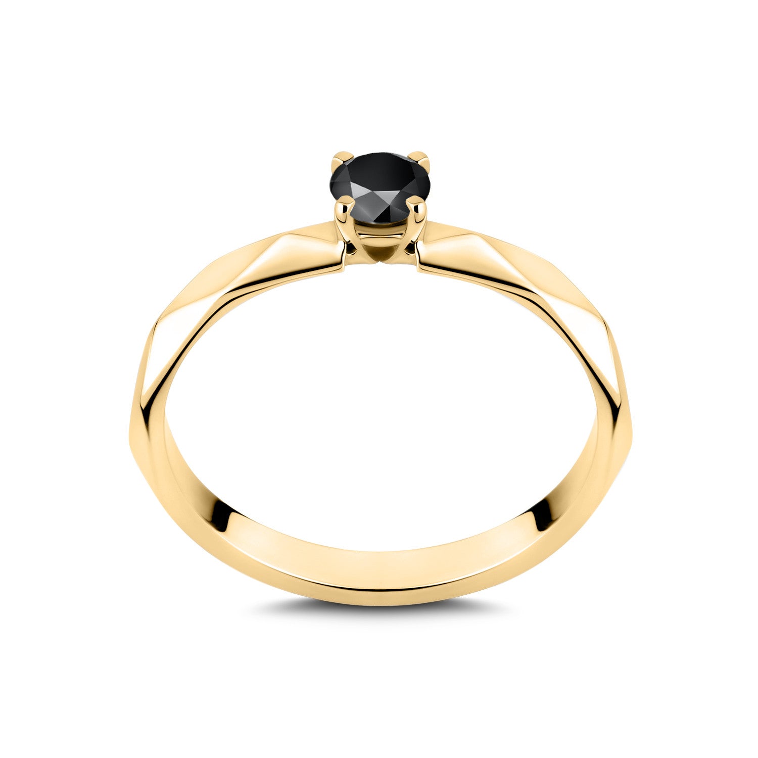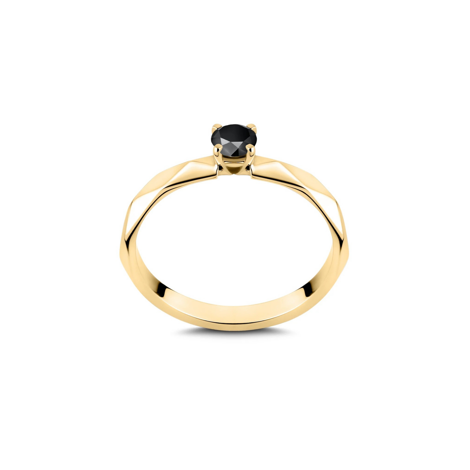 A beautiful diamond ring for lovers of harmonious, geometric designs. Its true adornment lies not only in the high-quality, very good-cut black diamond but also in the unique faceted band. The ring is crafted from 14K (585) yellow gold. The color and type of the central stone can also be customized to suit individual preferences.