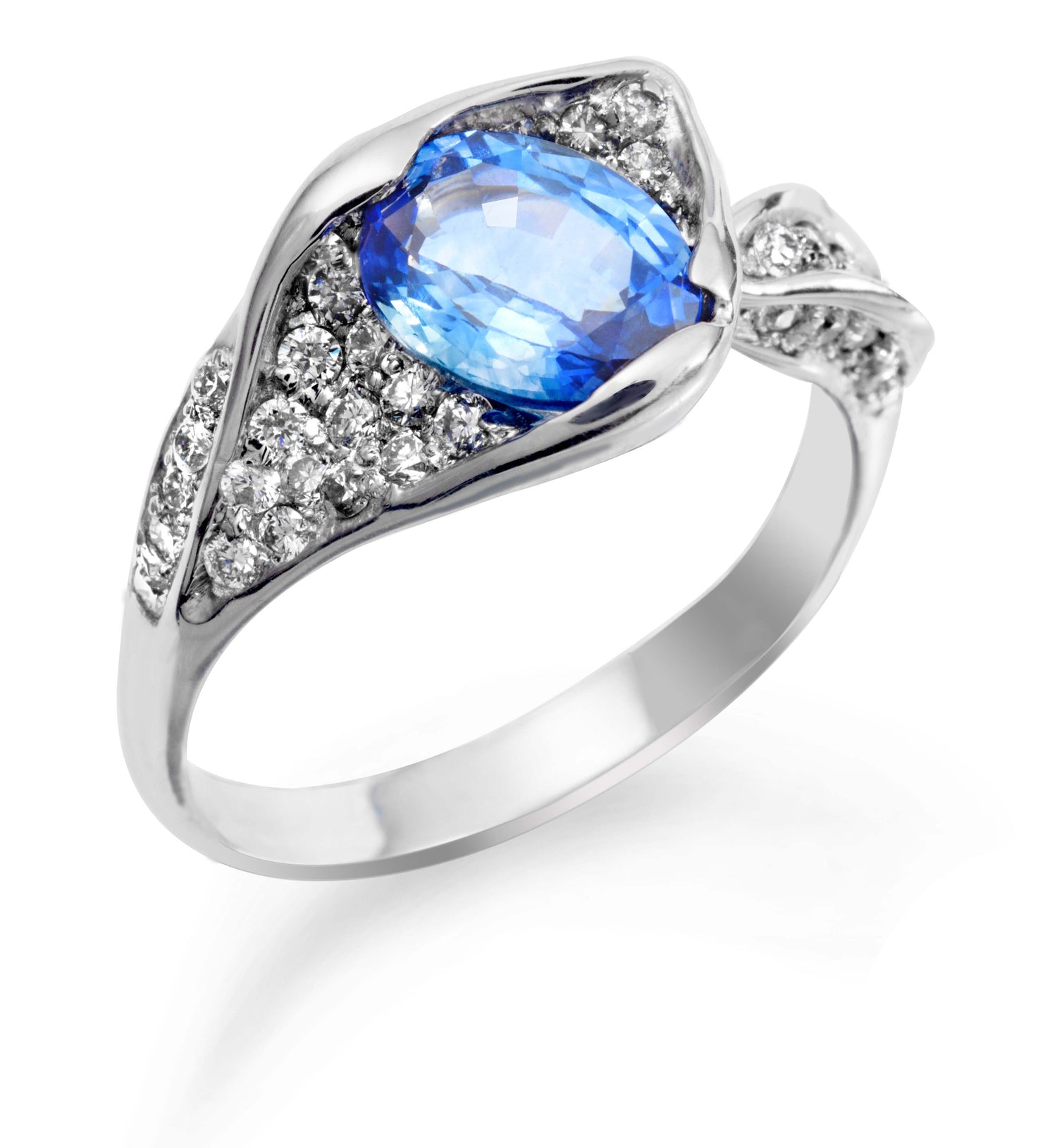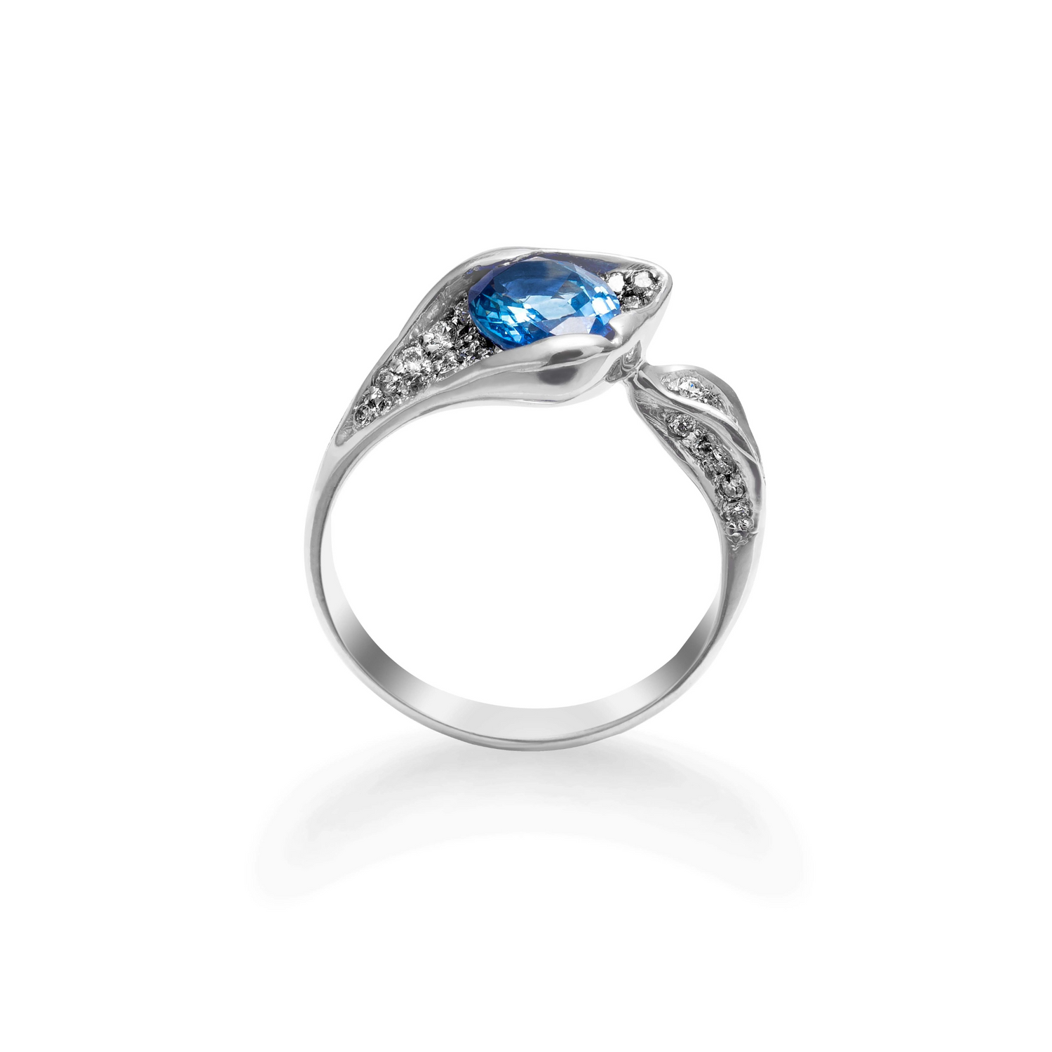 The designer of this unique sapphire and diamond ring was inspired by the floral motif of a dewdrop on a blade of grass. This beautiful ring boasts a very modern design. The centrally set precious stone is a sapphire with a beautiful color.