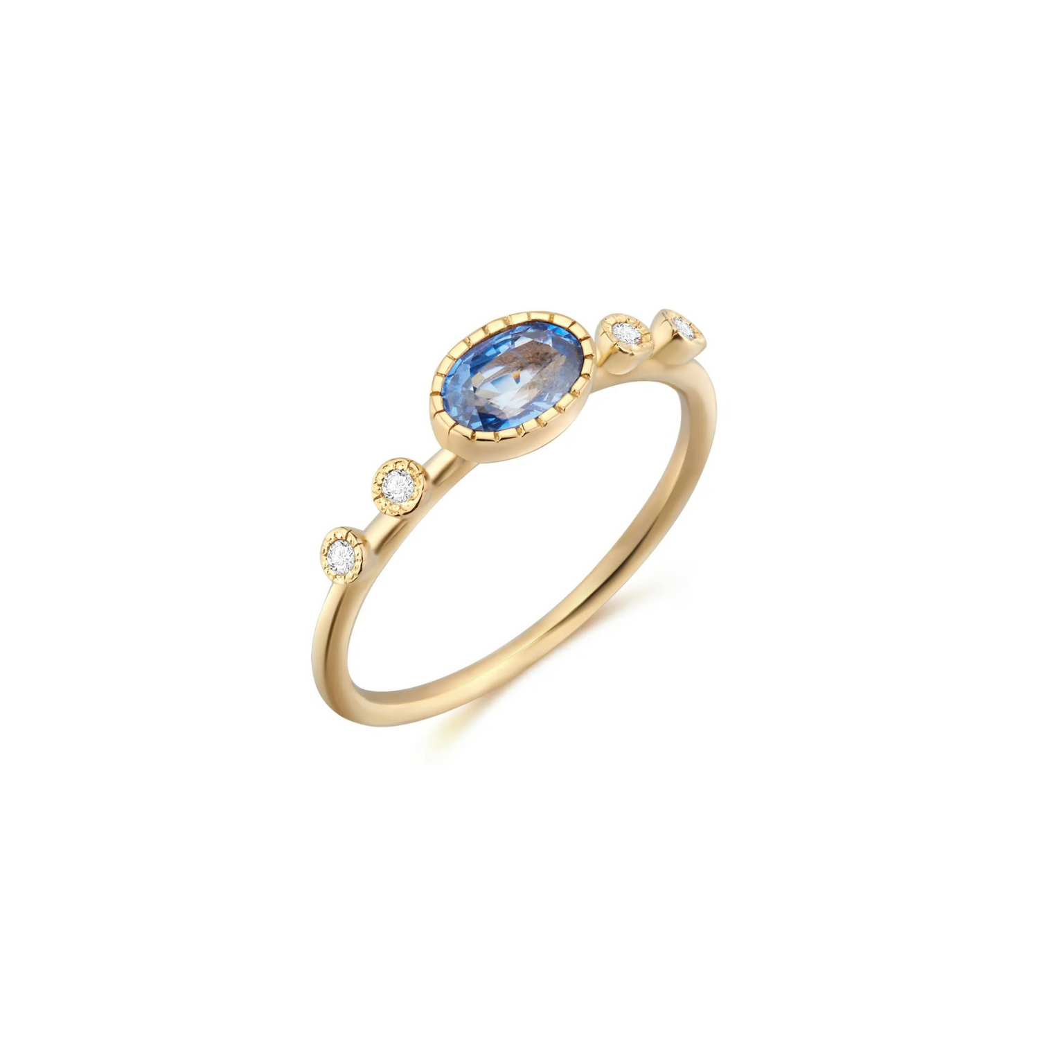 This fabulously beautiful diamond ring, uniquely shaped, beautifully showcases the stone. Adorned with a large oval-cut sapphire weighing 0.5 ct and four brilliant-cut diamonds weighing 0.09 ct, exudes elegance and refined brilliance. The classic yellow gold in which these top-quality gemstones are set complements the design.