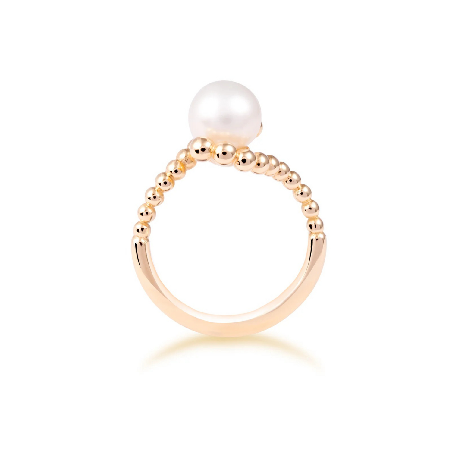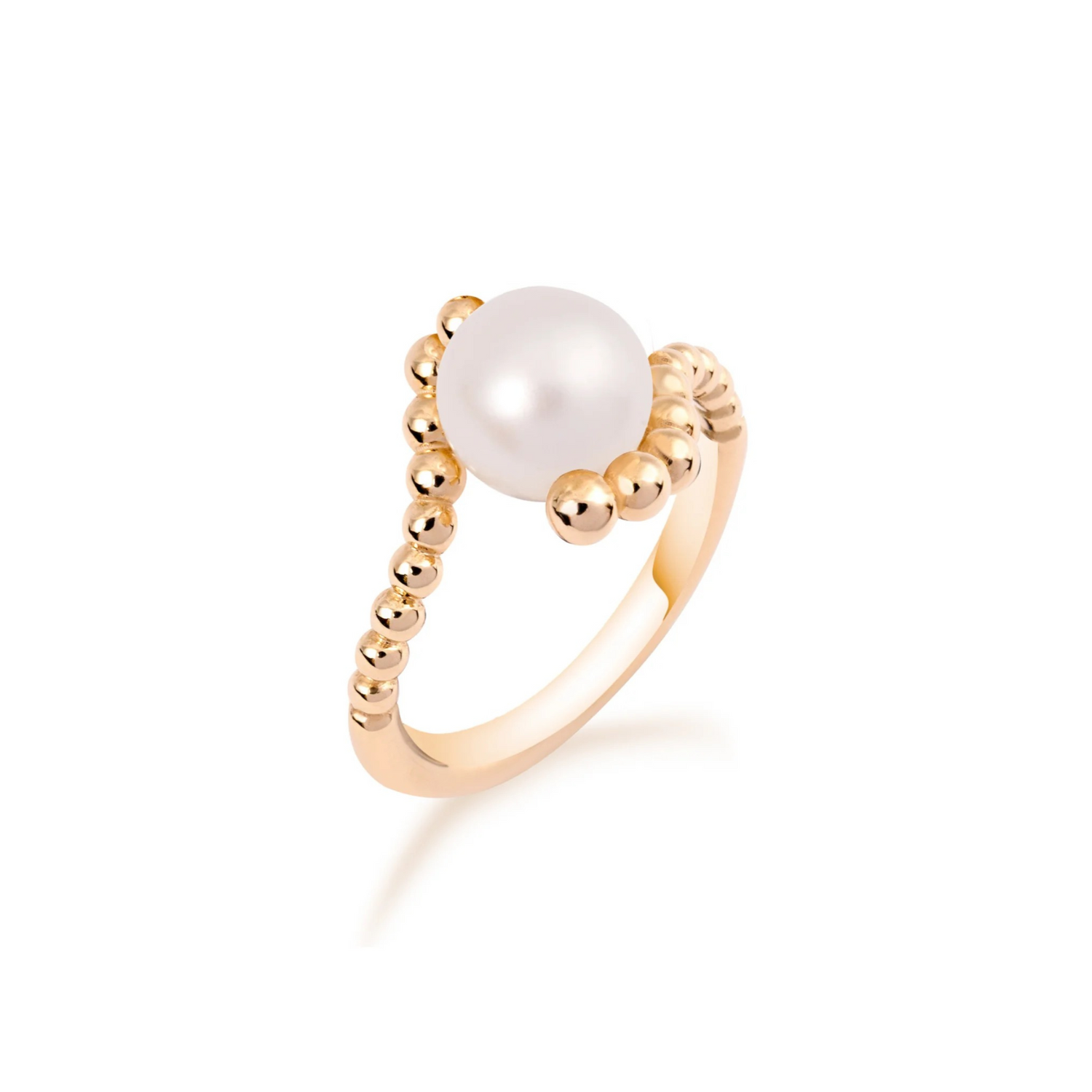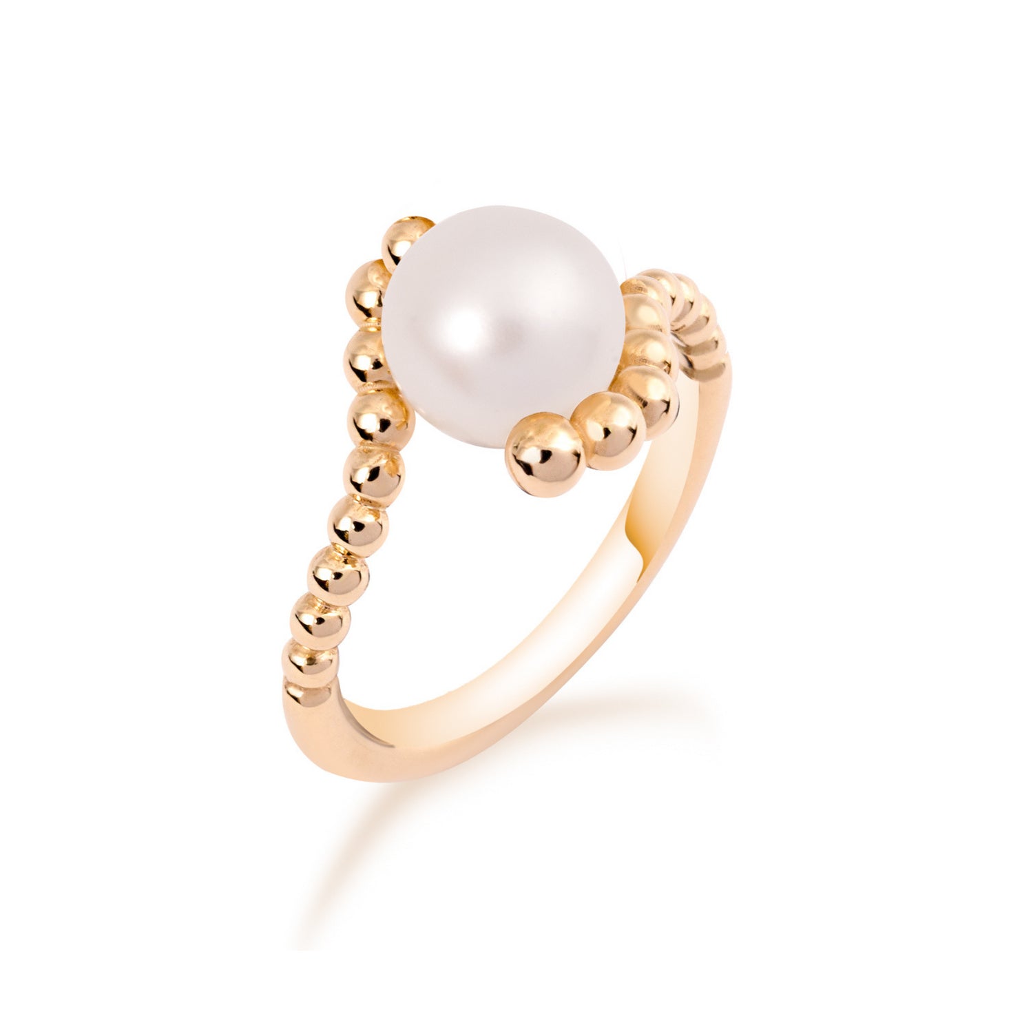 The ring is crafted from gleaming 14K (585) gold and a freshwater pearl with a subtle shimmer. The design, inspired by modern styling, creates a timeless composition of prized jewelry materials. A symbol of elegance and luxury, the pearl reveals its full beauty surrounded by gold. Its setting reflects the latest trends in jewelry and emphasizes the modern character of the piece.