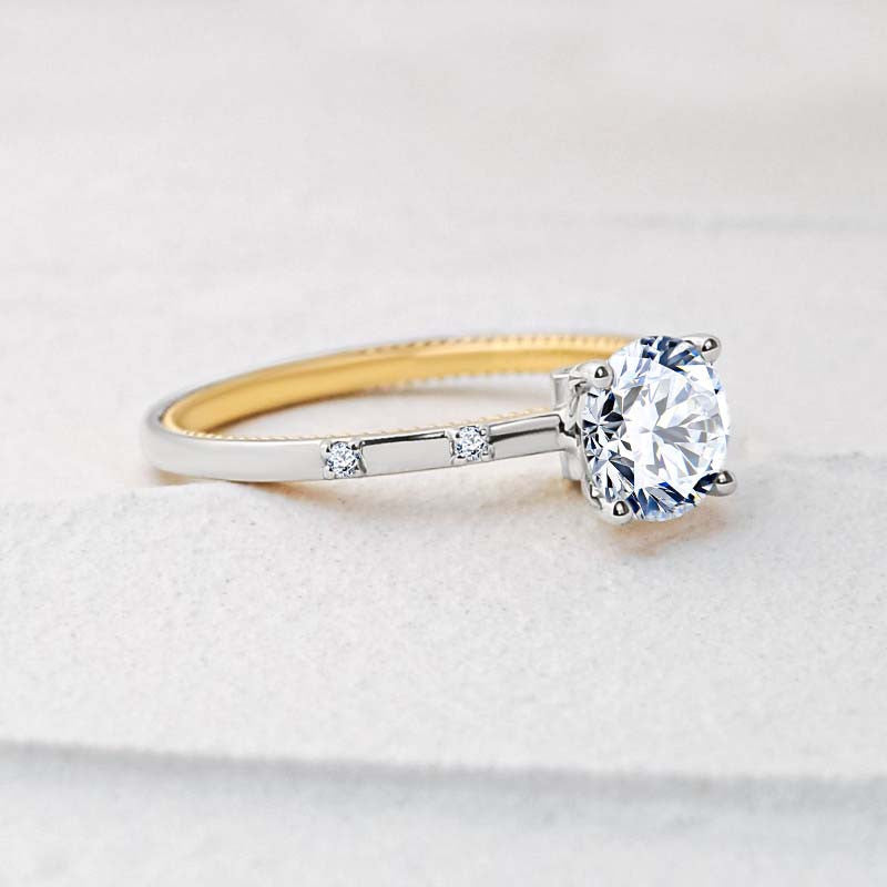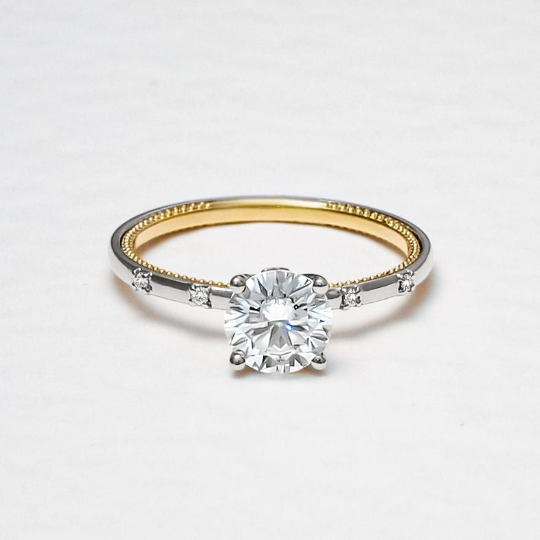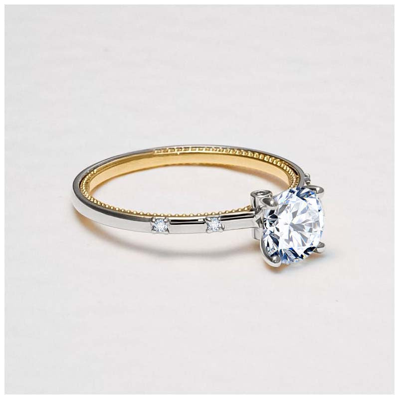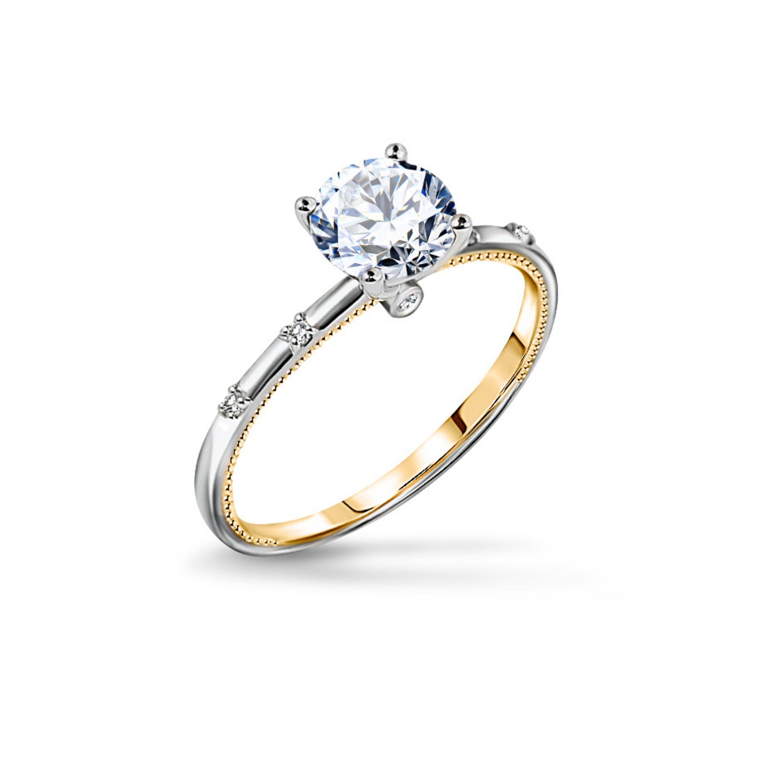 A delicate ring crafted from white and yellow gold with diamonds. The delicate band beautifully showcases the impressive central diamond. This ring is set with a 1ct lab-grown diamond. The diamond comes with a certificate from the International Gemmological Institute (IGI). This ring can also be made with a natural diamond – please contact us for a personalized quote.