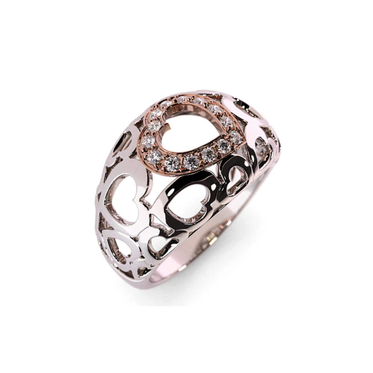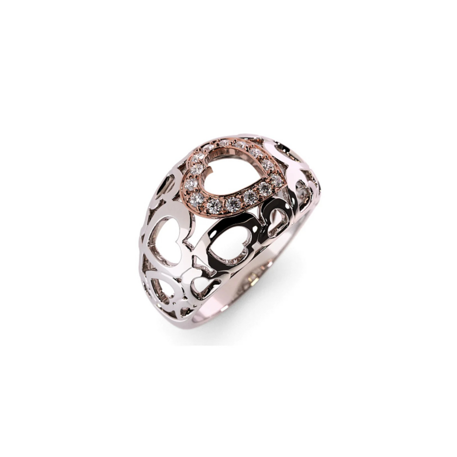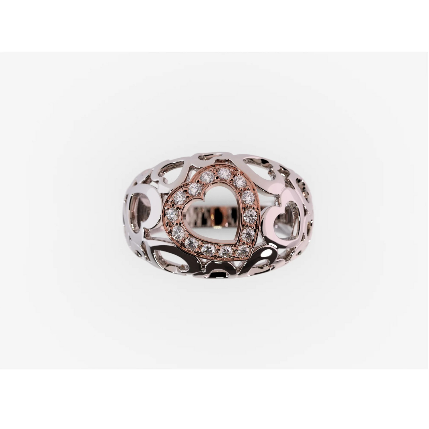 A romantic ring with intertwining heart motifs. Crafted in white and rose gold, this ring is set with 0.12 ctw diamonds.