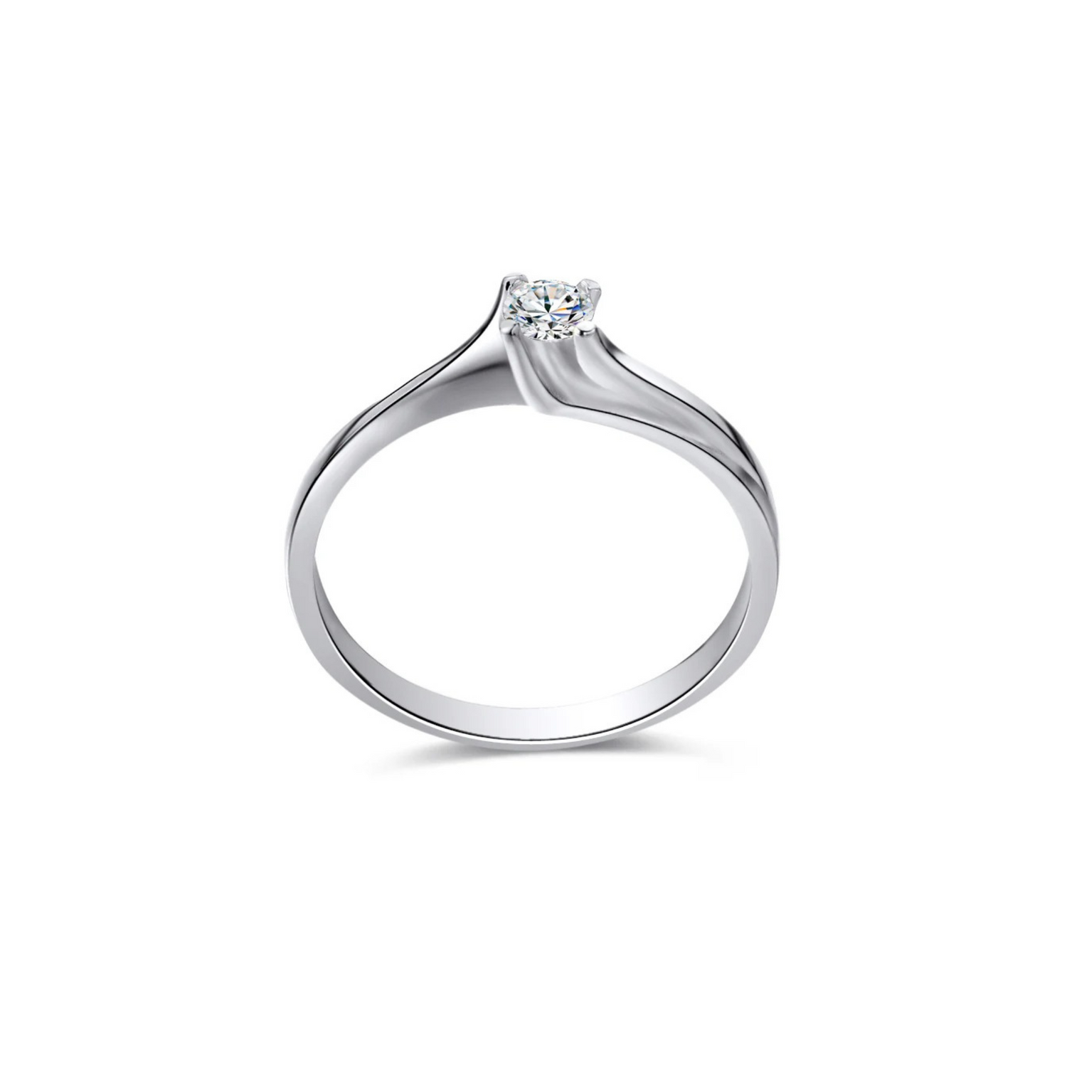 A classic with a striking finish, this engagement ring is perfect for women who appreciate jewelry with unique designs. The stunning brilliant-cut diamond is accentuated by asymmetrical, interlocking arms, joined by a simple 14-karat white gold band. This band provides the stone with an exceptional setting. It's a harmonious composition that will look beautiful on the finger.