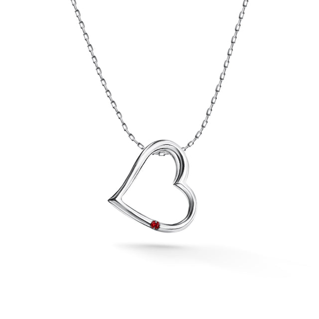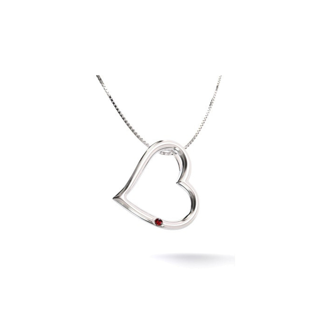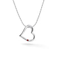 This delicate, heart-shaped pendant made of 925 sterling silver captivates with its delicacy and elegance. A ruby with a deep, saturated color and beautiful brilliance adds charm, delicately set on the side, adding a unique character to the piece.