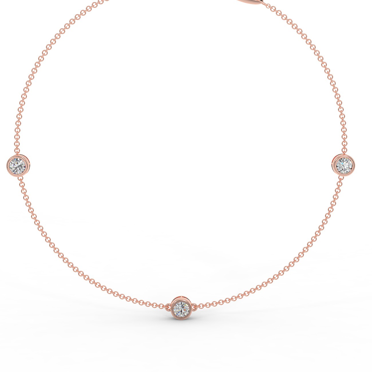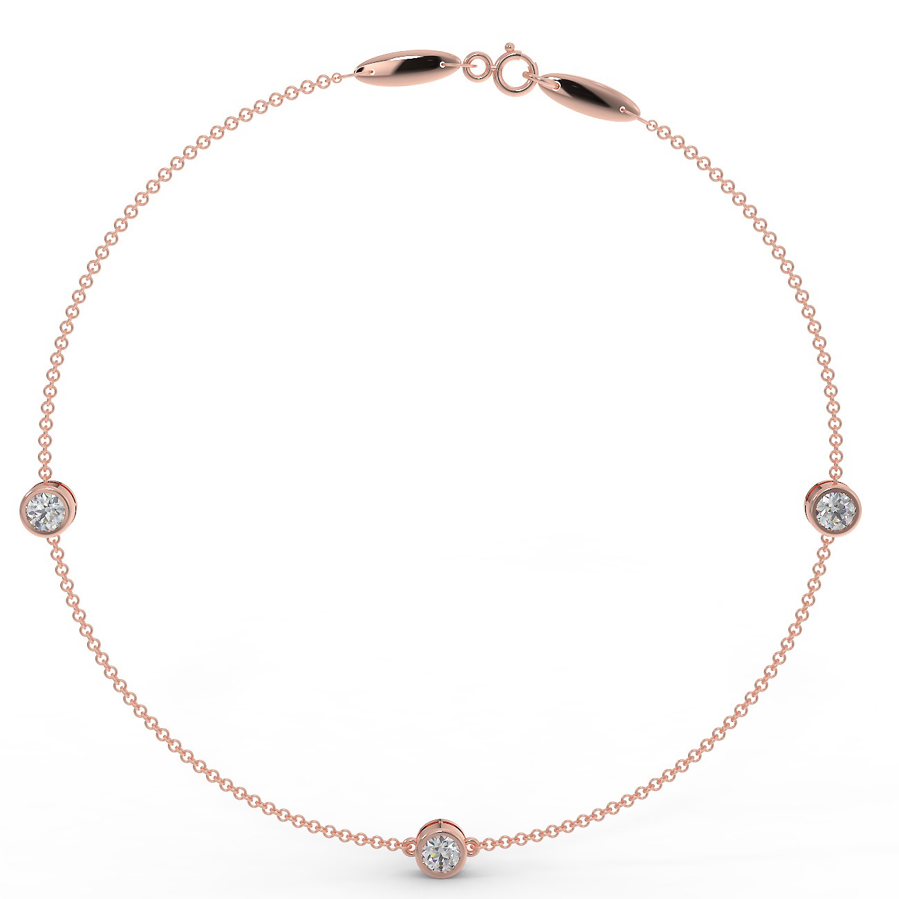 A subtle and elegant bracelet crafted from 585 (14) rose gold. Three symmetrically spaced diamonds, set in cargi, totaling 0.90 ctw, complete the look. This lightweight bracelet is designed to complement a variety of styles. Its understated elegance can complement a casual dress or a special occasion.