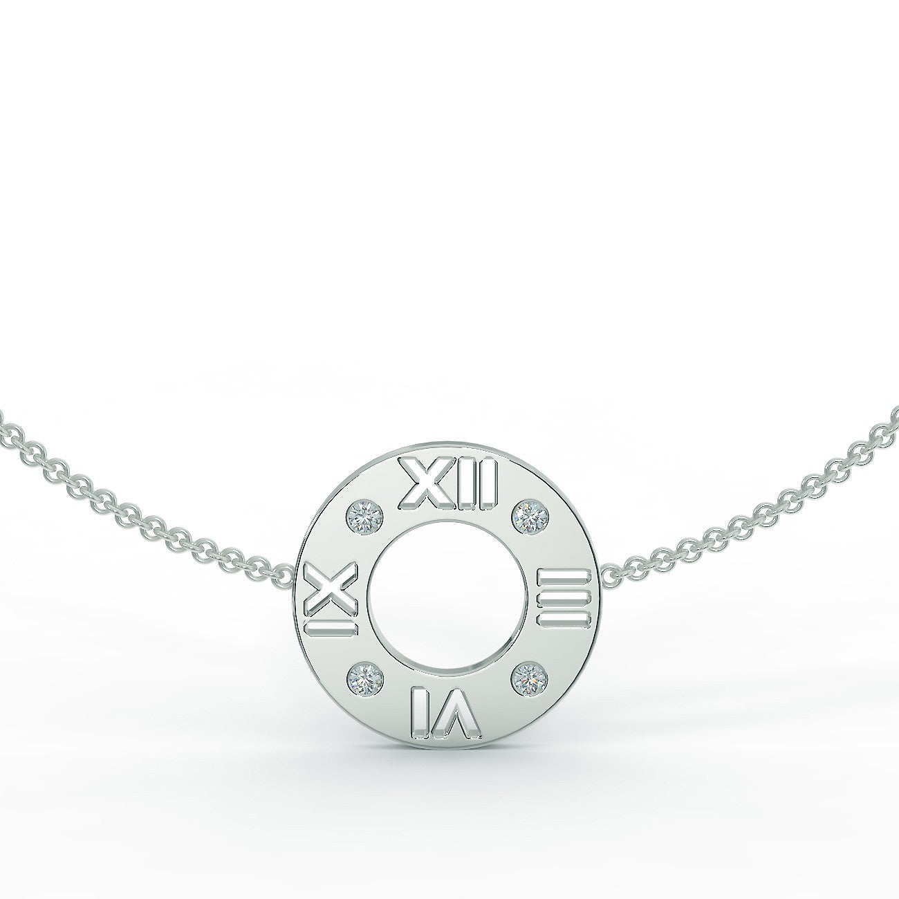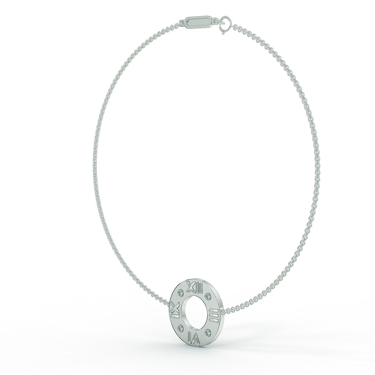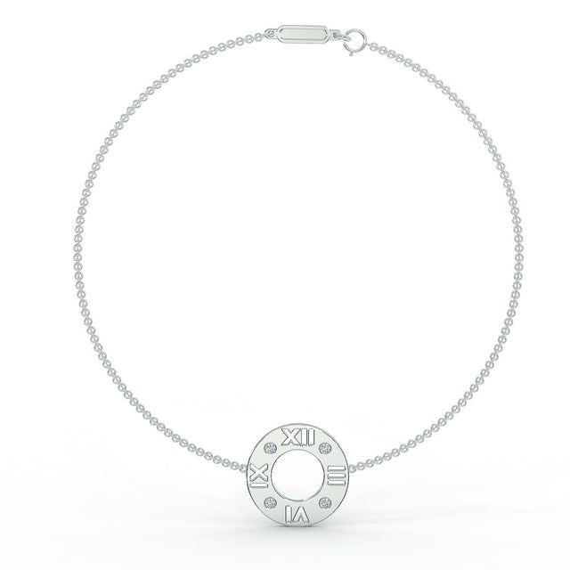 A classic, beautifully crafted bracelet in white gold. The bracelet features a unique, round element resembling a clock face with Roman numerals, set with diamonds weighing a total of 0.12 ctw.
