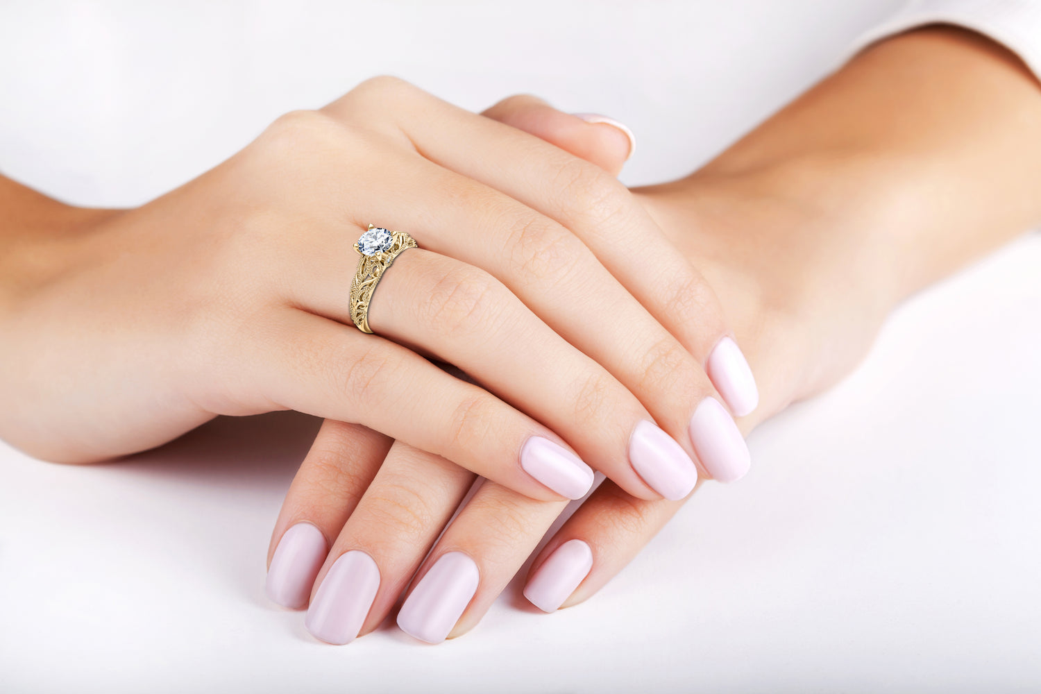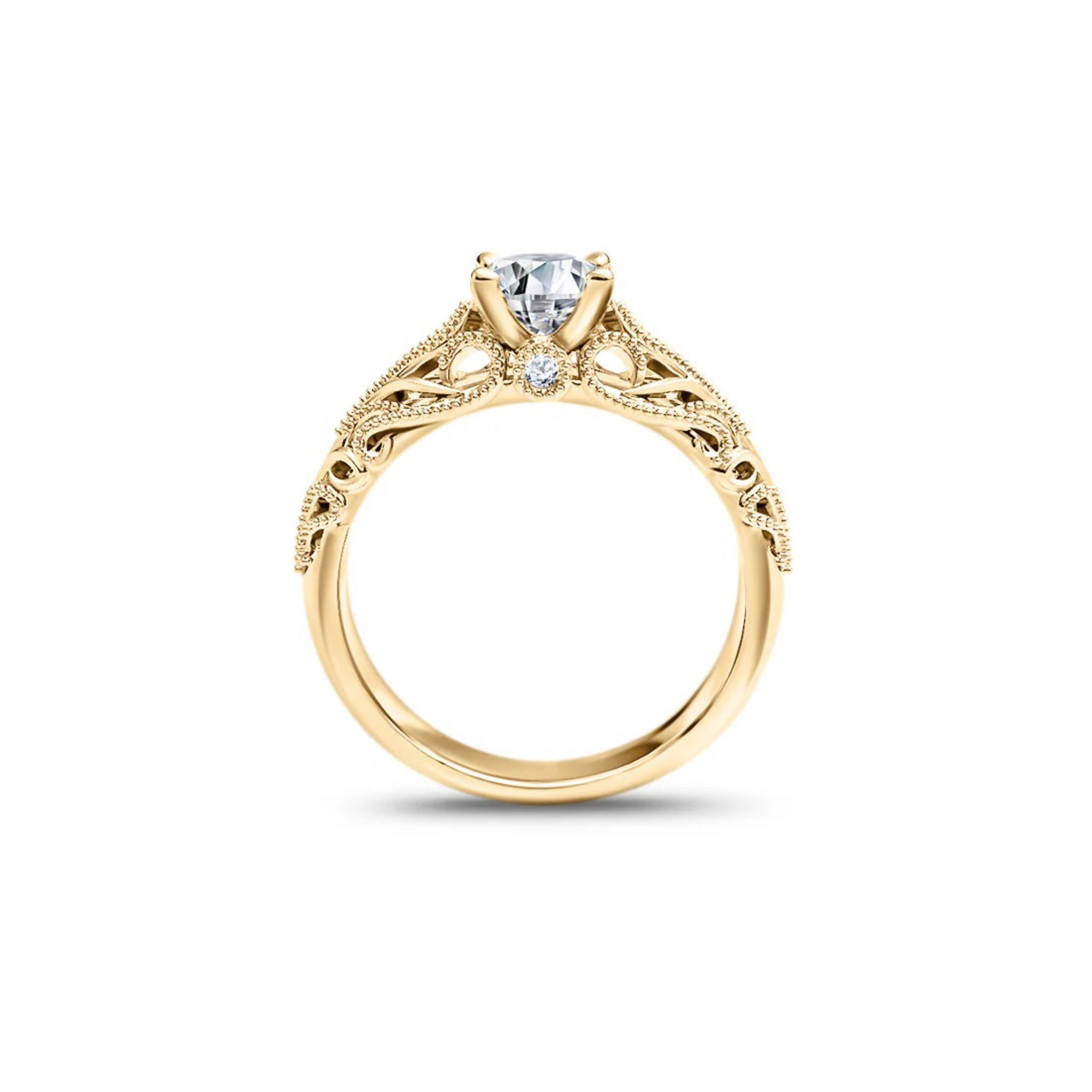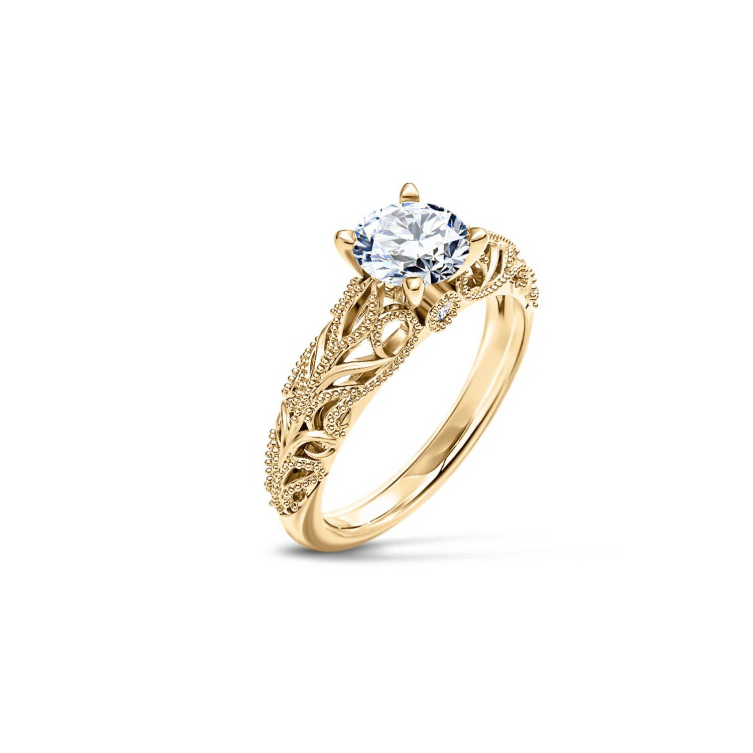 This unique engagement ring features a central 0.50ct diamond set in six prongs. The ring is adorned with a decorative pattern and milligriffin embellishment, highlighting the precision of its craftsmanship and lending the piece an elegant, fine jewelry character. Subtle yet expressive details make this a unique piece for lovers of jewelry with character.