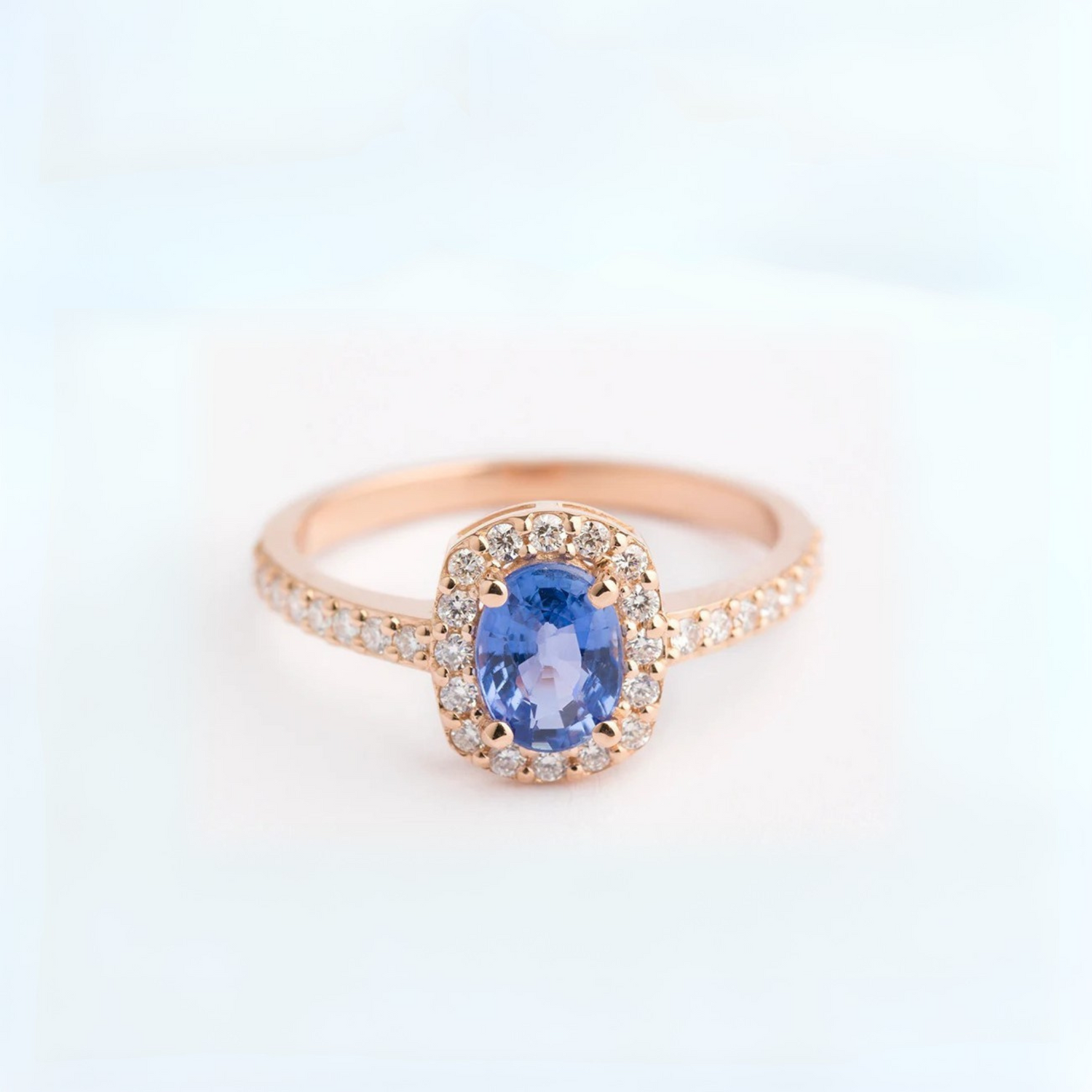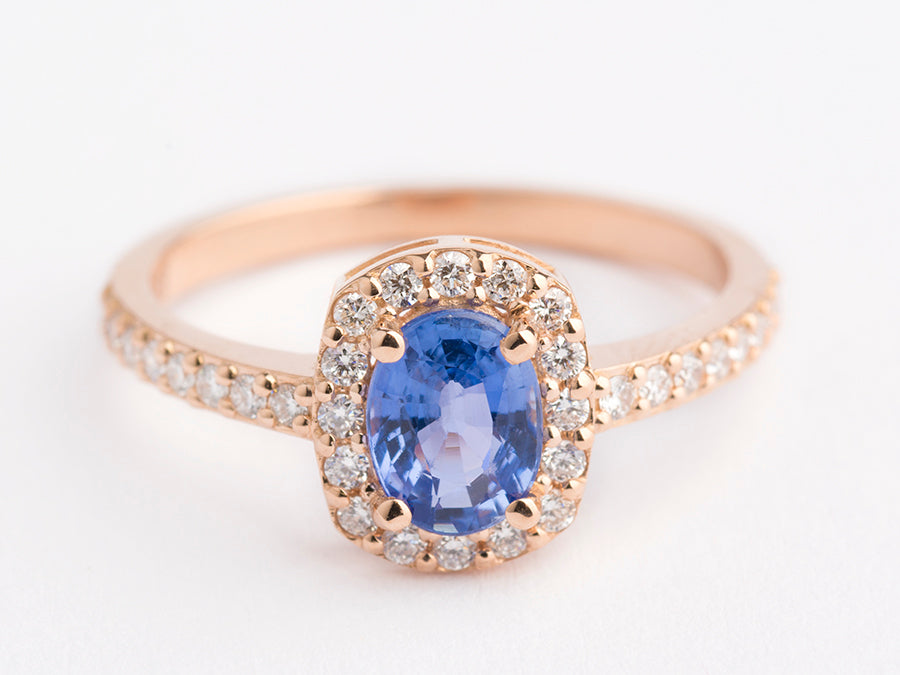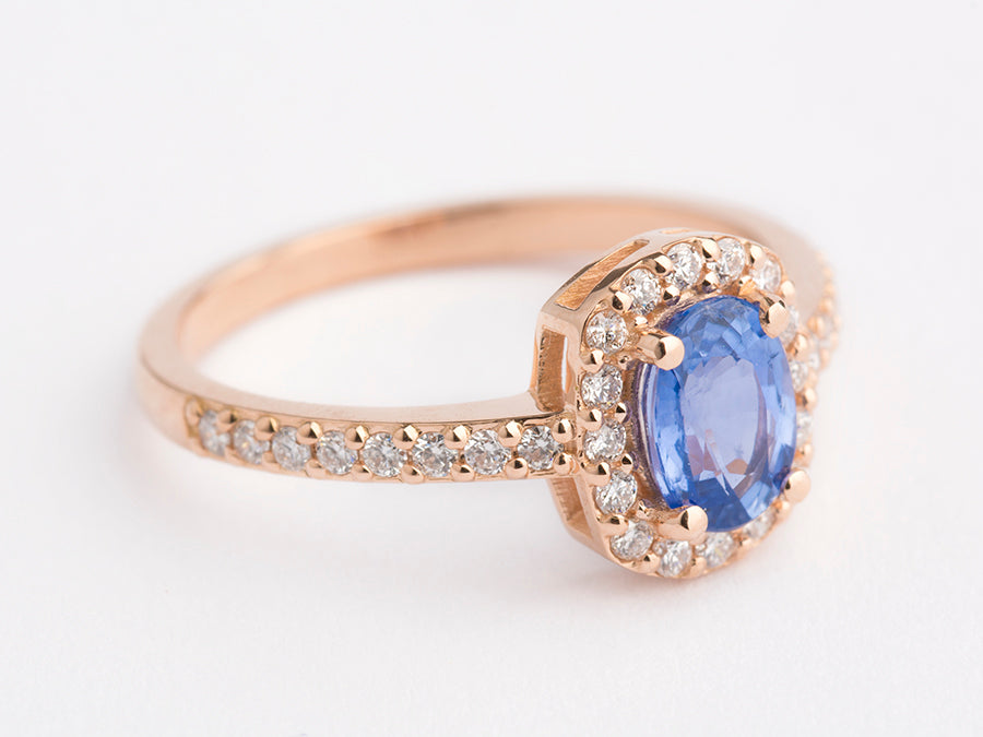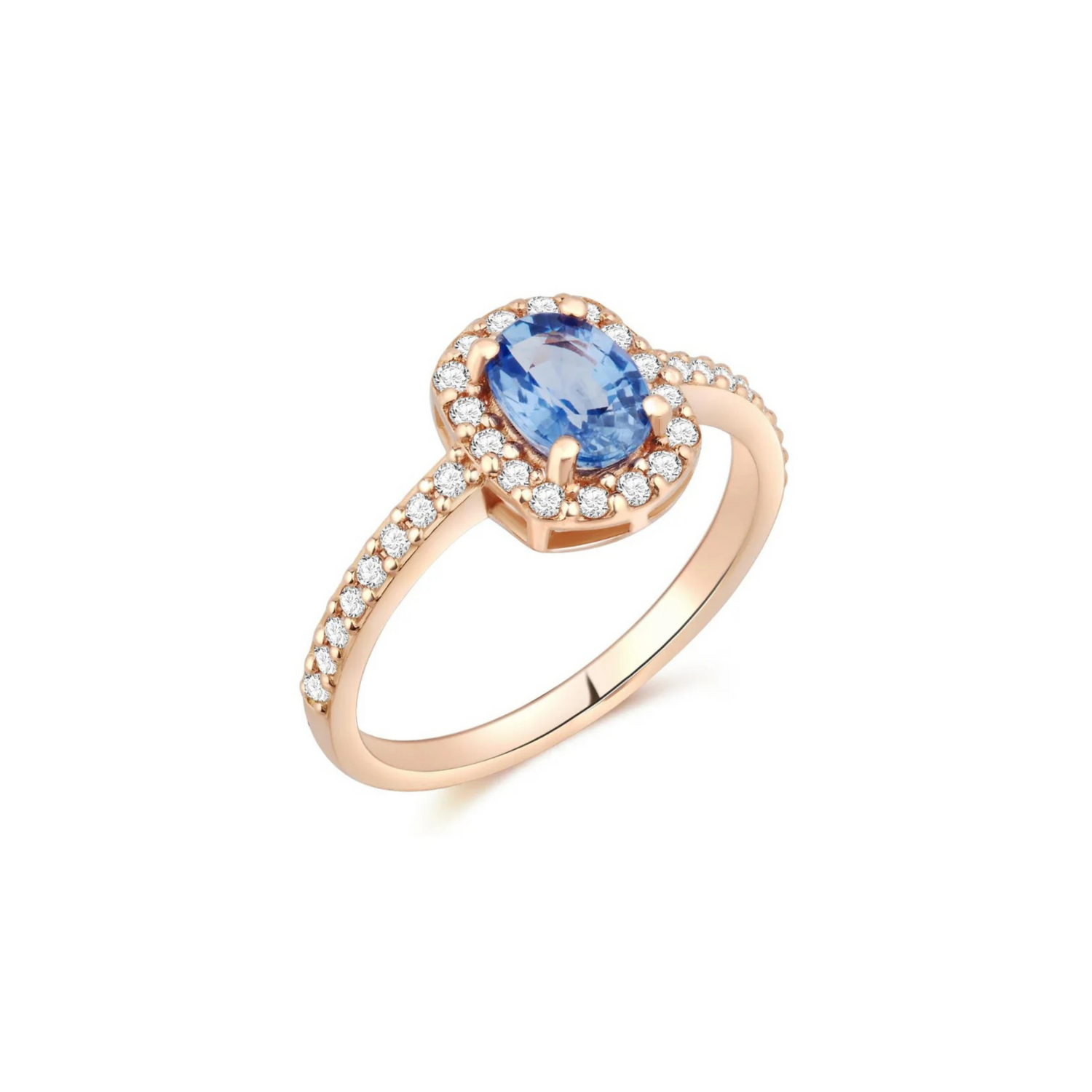 An original and unusual combination of fashionable rose gold and the most beautiful gemstones – diamonds and sapphires. The star of this composition is a large, oval-cut, 1.05-carat Caylon Blue stone, set in the center of the ring. It is surrounded by transparent diamonds totaling 0.35 carats, perfectly accentuating its unique color and the exceptional shade of gold.