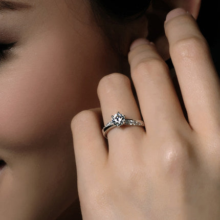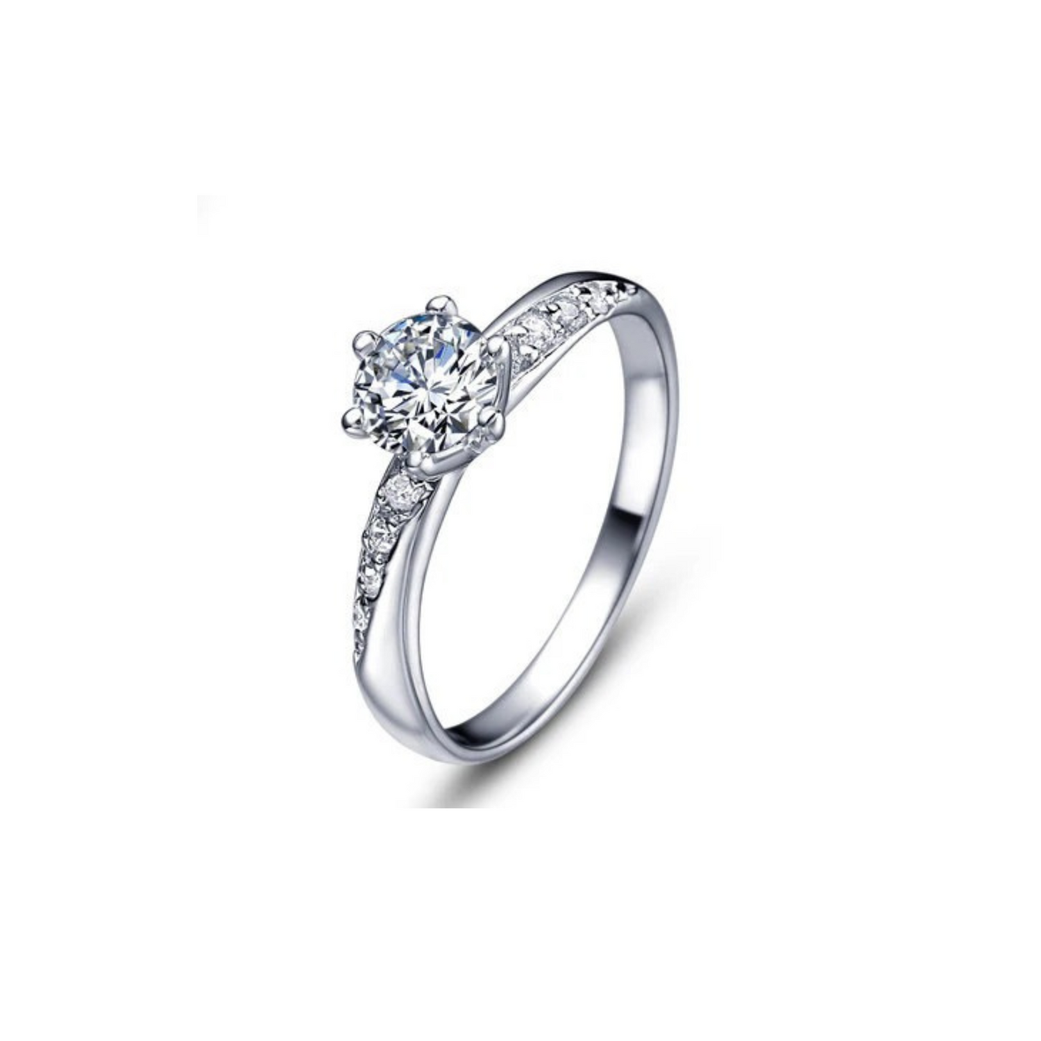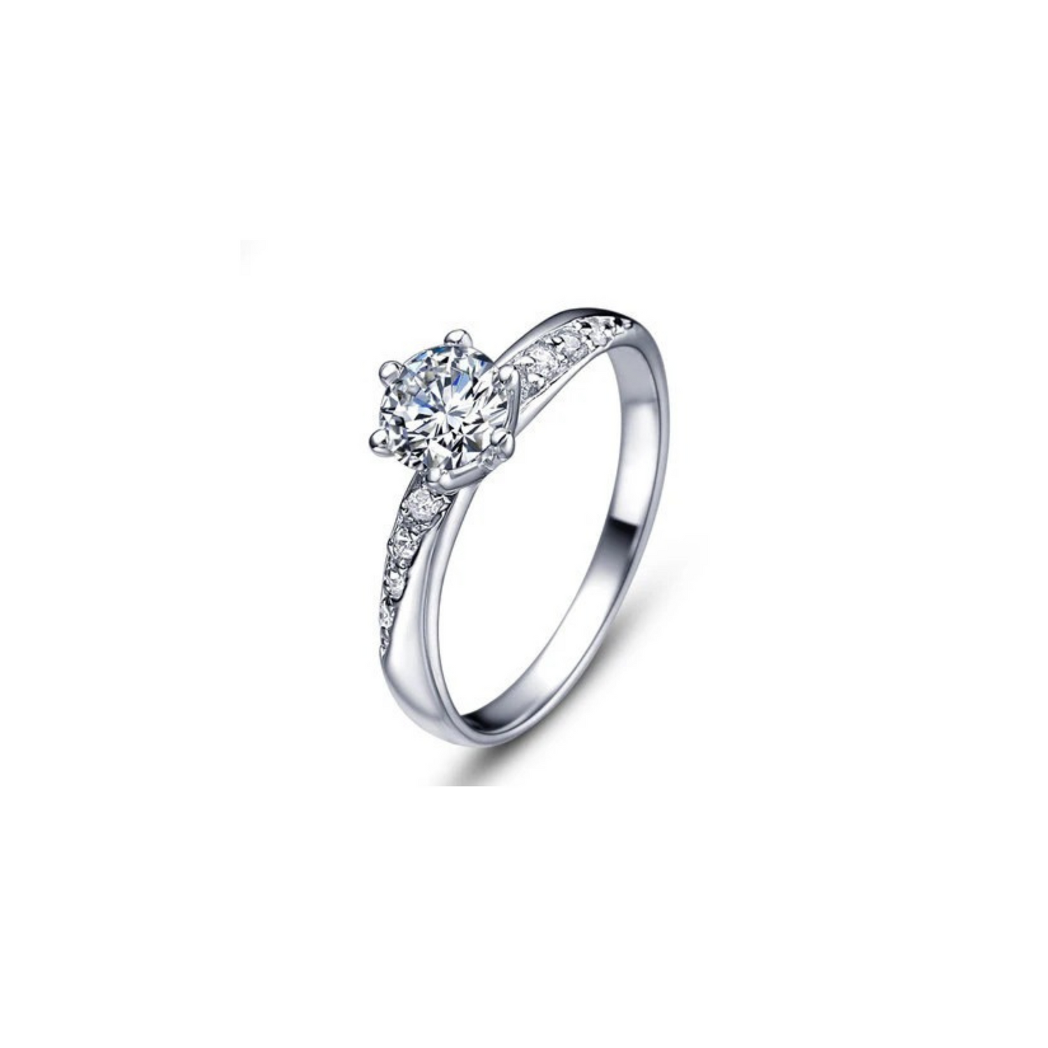 This engagement ring features a 0.38-ct center diamond. The ring features a slightly beveled set of diamonds on either side of the center stone. The total weight of the stones in the ring is 0.55 ctw.